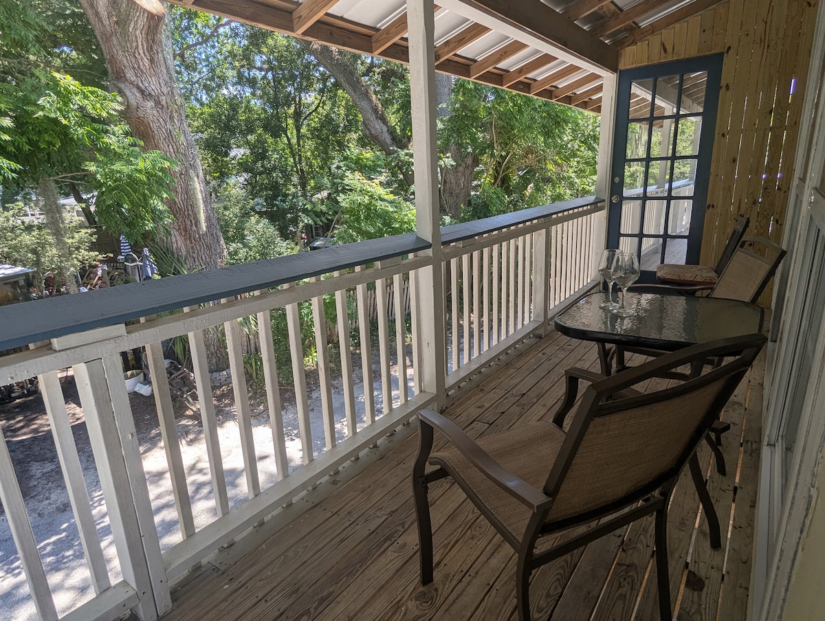Our 600 sq ft apartment offers a private balcony shaded by centuries-old live oaks, alive with birds and squirrels. The view also includes a touch of our neighbor’s eclectic backyard, adding local character. Inside, enjoy a king bed, separate living area, and kitchen. A short 1/2 mile walk brings you to historic downtown St. Augustine.