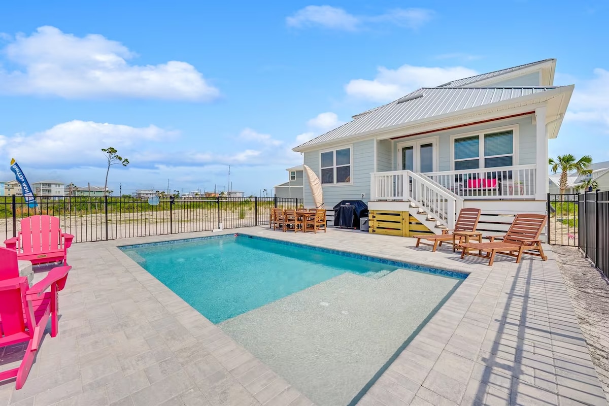 Our two spacious homes are pet-friendly with fenced-in yards and a joining elevated walkway. Sandy Paws has 5 bedrooms for 10 guests with bathrooms on all 3 levels while Sunny Paws has 2 bedrooms for 4 guests with 2 bathrooms. Each house has a large deck with a screened-in porch, perfect for viewing beautiful sunrises and evening sunsets over the gulf. Sink your toes into the white sands of the emerald Forgotten Coast of Cape San Blas, only a 7-minute walk and a 4-minute walk to the bay!