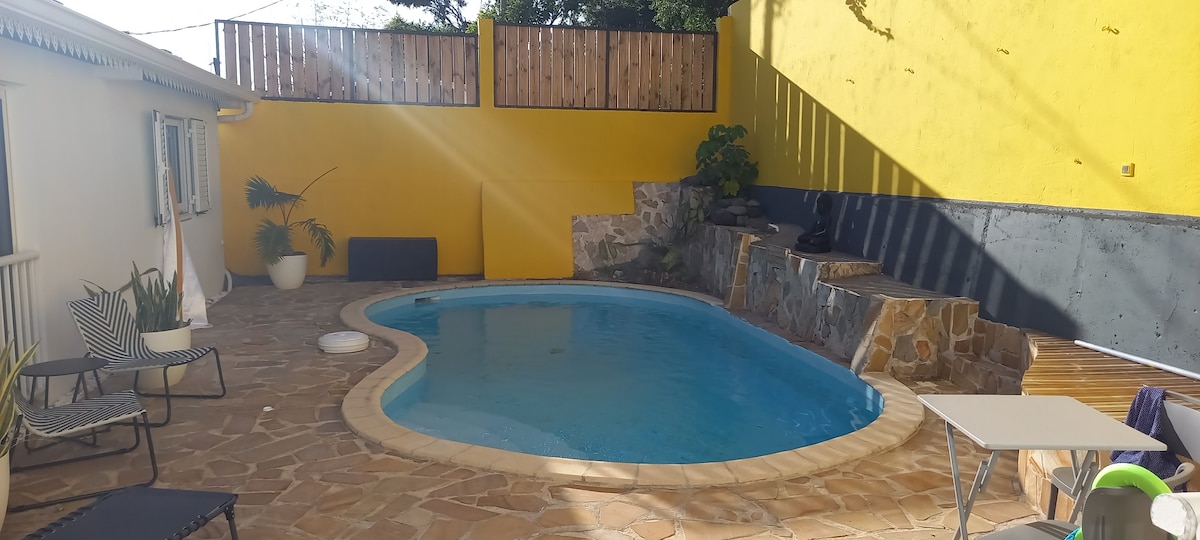 Villa moderne tout équipé avec jacuzzi/mini-piscine de 2,70mx2,70m , 2 chambres avec lit King-size 160x200 dont une sur-mesure équipé de climatisation, armoire de rangement et télévision. Salle de bain confort avec douche à l'italienne, WC moderne. Salon équipé de fauteuil, télévision et table de repas. situé dans un endroit calme, à 10 minute de saint pierre et de la plage avec jacuzzi privatif uniquement pour votre logement, parking.