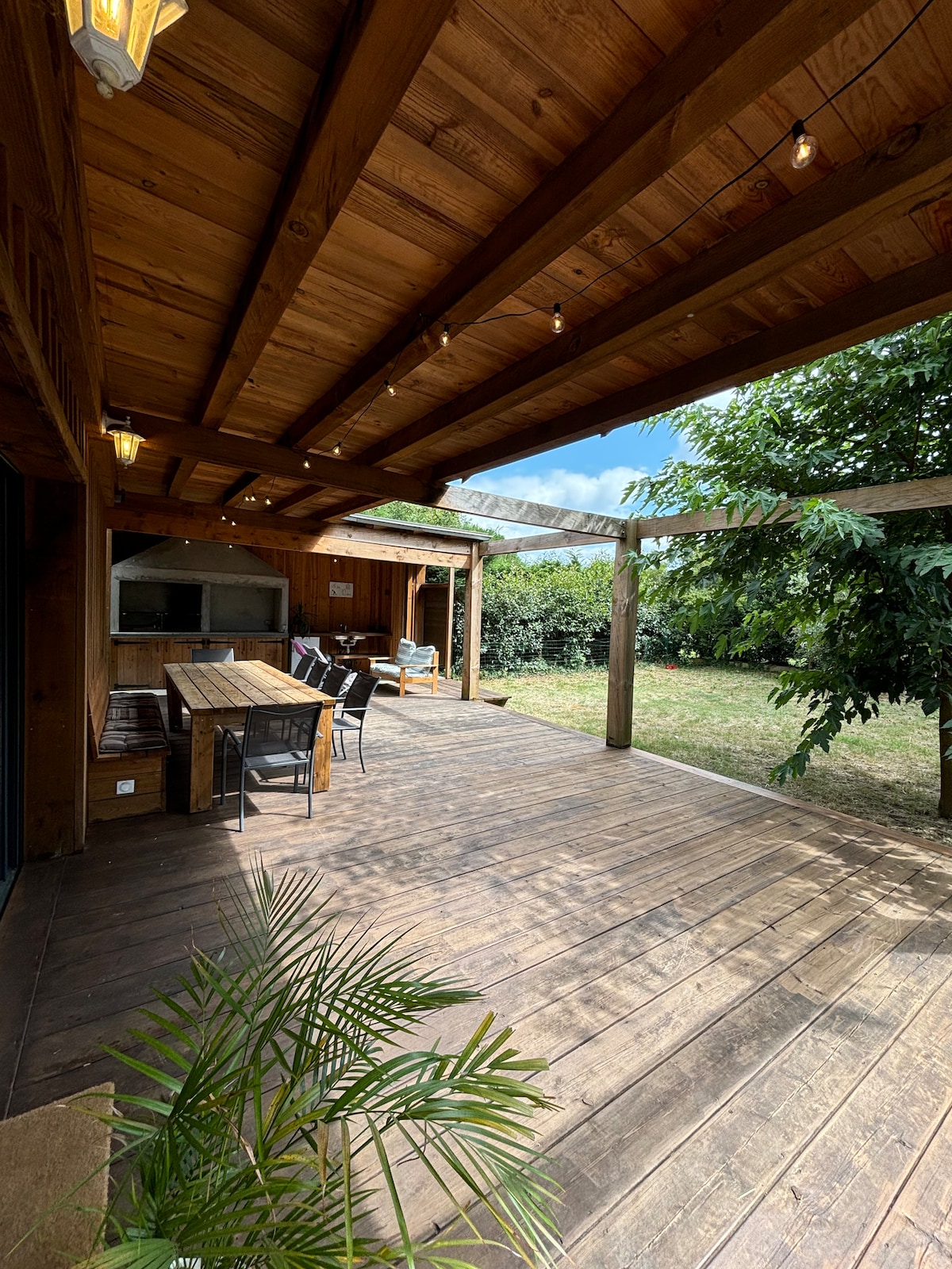 Jolie maison pour un séjour détente en famille ou entre amis. Vous trouverez 4 chambres au total (2 avec lits de 160, 1 avec lit de 160 et salle d’eau privative, 1 avec lit de 160 + banquette convertible) 1 salle de bain (douche+bain), 1 cuisine ouverte entièrement équipée et un salon avec 2 canapés. La salle à manger est dotée d'une grande baie vitrée donnant sur une grande terrasse en bois. A l'extérieur, tout y est pour vous faire passer de bons moments à l'ombre des chênes ou d'un parasol.