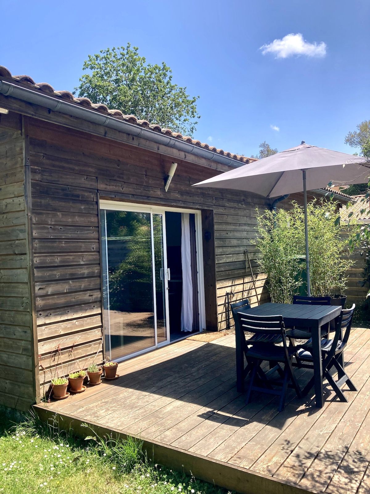 située a Biscarrosse ; proche du lac nord en nouvelle aquitaine; entourée de nature; la "cabane de Mayotte" est une agréable petite maison de vacances. elle bénéficie d une grande terrasse abritée d une pergola et d un grand terrain verdoyant clos. vos animaux apprécieront l espace qui leur ait dédié. 2 places de parking face à la maison. connexion wifi gratuite. une grande terrasse entourée de balustrades ouvrant sur un jardin. un coin barbecue ; une grande table ;salon de jardin.