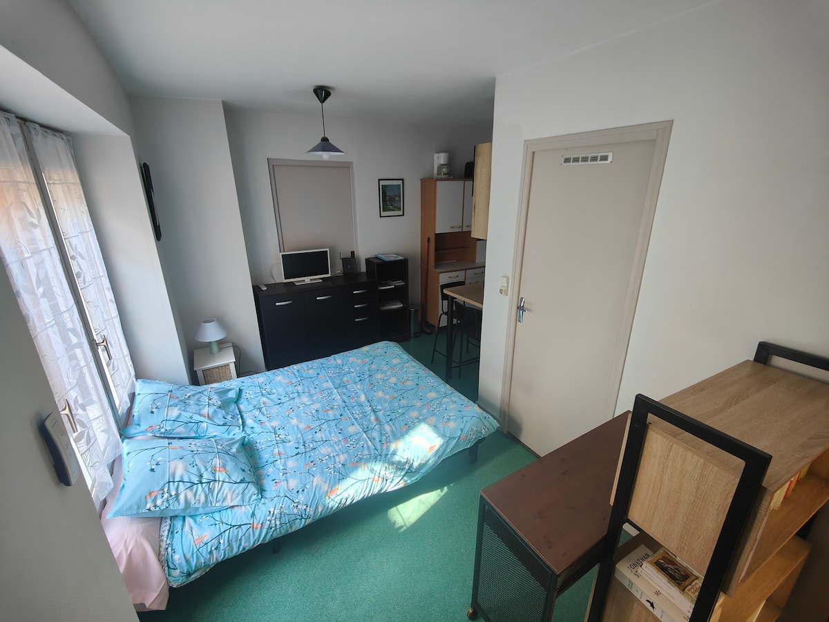 Studio en RDC avec canapé lit BZ situé proche de l'hyper centre de limoges, avec un coin cuisine équipée, une salle de bains douche WC et un petit bureau. il y a 3 marches dans le studio juste après l'entrée pour compenser une différence de niveau.