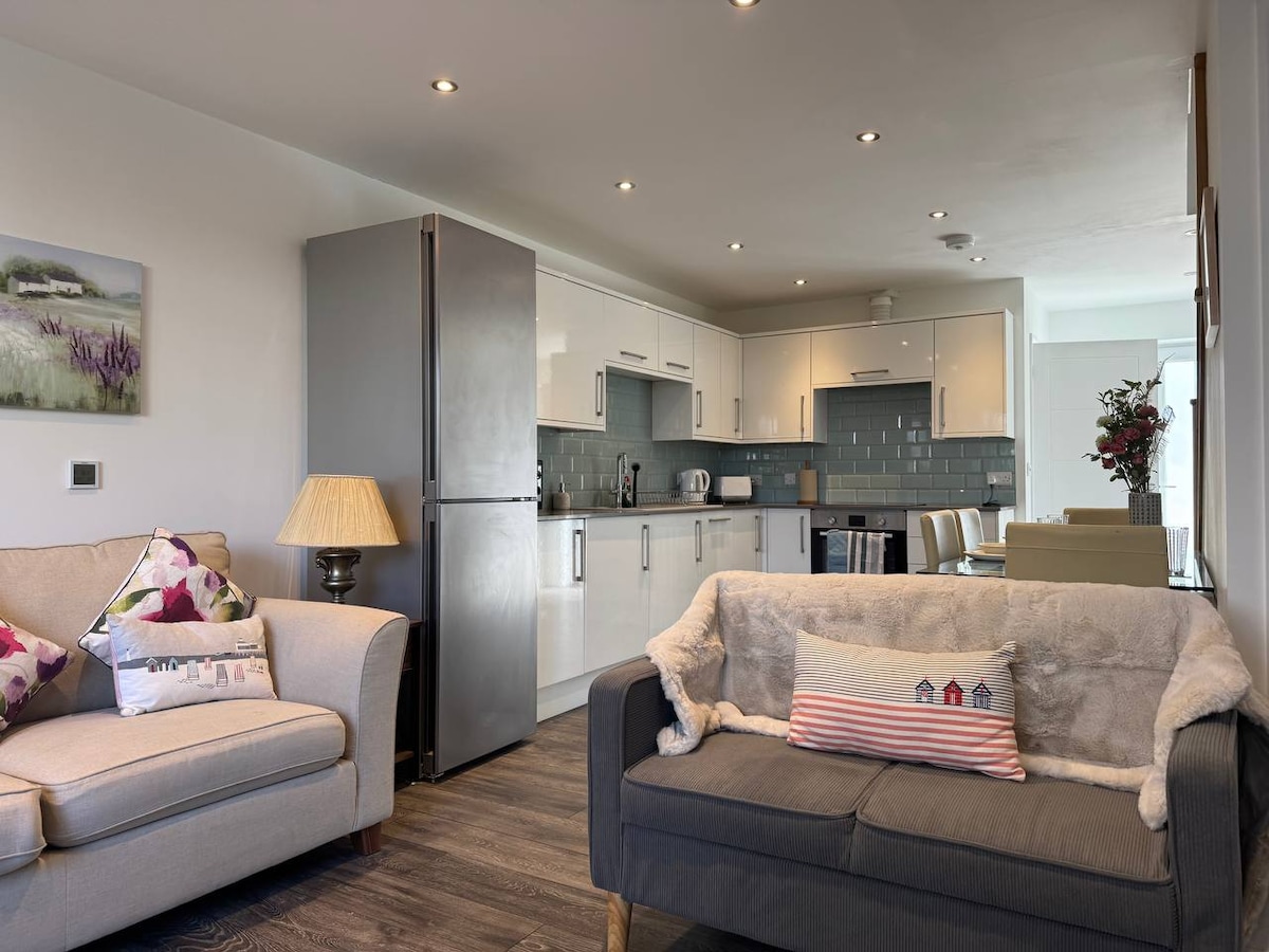Fantastic High Spec Luxe Penthouse. Bifold doors open from the kitchen/living room onto a private south-facing balcony. The lower floor opens onto a deck with steps leading to a private garden. Modern fully fitted kitchen & living room with woodburner. Three bedrooms: Kingsized Master Bedroom; walk-in wardrobe, Double bedroom, and small double with an ensuite shower. Luxe Bathroom with walk-in rainforest shower. Hot Tub. (message for rate ) Superfast Fibre. Parking. BBQ. Dog friendly