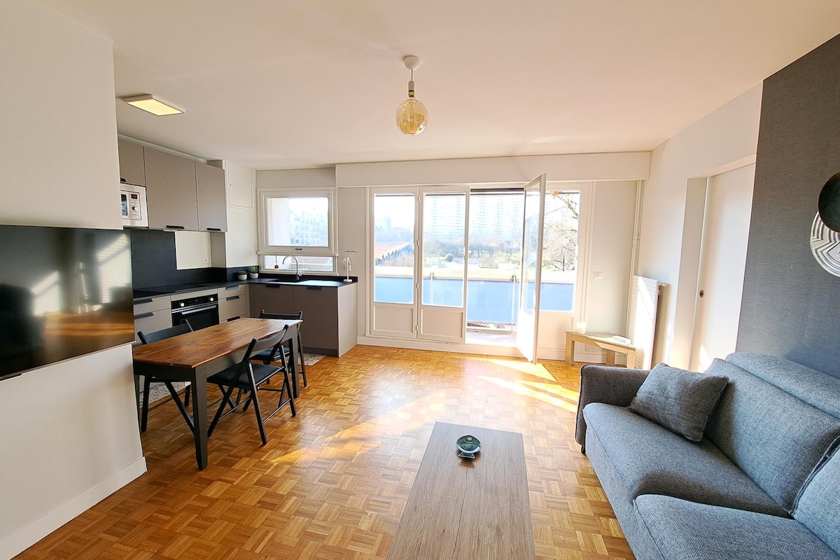 Top-floor haven with a large, sunlit balcony and an unobstructed Eiffel Tower view. Newly refurbished by a designer, it features an Italian shower, a comfy queen-size bed, and a quality sofa bed for groups of 3–4. Bright living/dining area, fast broadband and Netflix. Secure building in a vibrant neighborhood packed with cafés, restaurants, and shops. Metro station just 2 minutes’ walk. Perfect for couples, friends, or business stays.