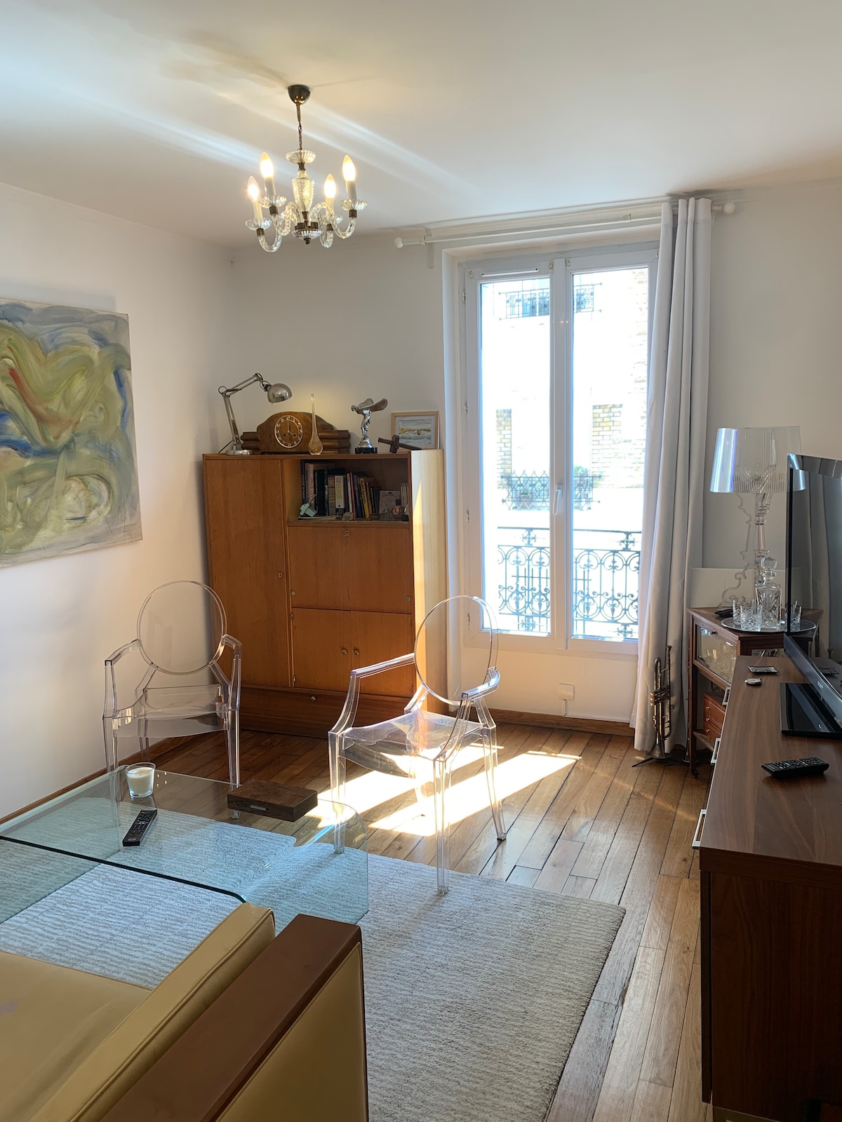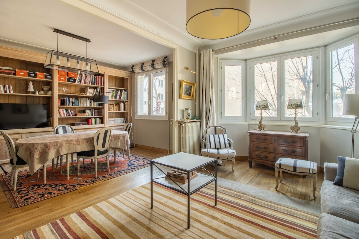 Quiet traditional Parisian apartment in a 19th Century dressed stone building and street on 5th floor with elevator : double living room, bedroom, fully equipped kitchen (dish washer and washing machine/dryer), balcony and private underground parkplace (4 minutes on foot). I furnished and decorated it with love, including paintings. In a neighbourhood vibrant of shops and restaurants, it is 2 minutes on foot from the Metro, from which all Paris must-sees are within a 13-30 minute range.