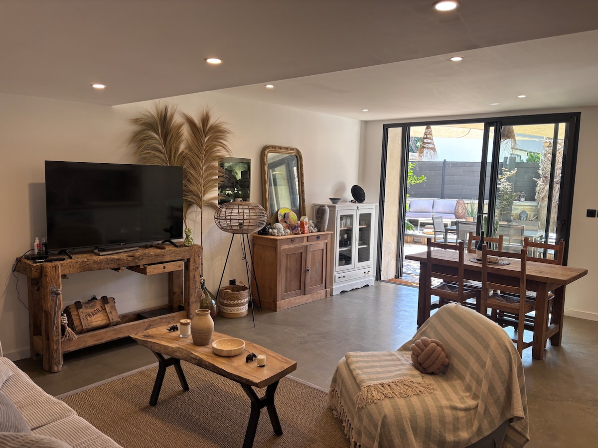 Maison neuve St-Laurent d'Aigouze. Détente assurée sur la terrasse où vous pourrez y déjeuner ou dïner au bord de la piscine. Chambre avec salle de bain . 1 lit D 160x 200 . Salon : Canapé lit A l'étage : Chambre avec 1 lit double 140x 200 ou 2 lits de 1 personne . Salle de bain. 2 Wc rdc + étage. A 5 minutes à pied du centre du village, des commerces et du château de Clavières où se passe le tournage de la série " Ici tout commence " Aigues-Mortes à 10 minutes en voiture. 15 km des plages