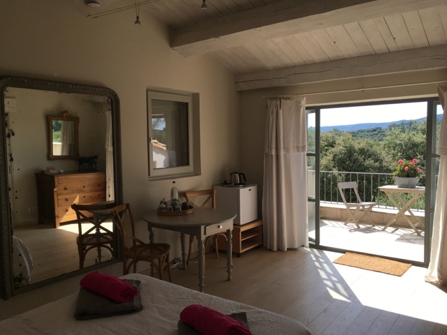 Studio 21 m2 confortable pour 2 personnes : lit bultex, coin bureau, accès indépendant, pas de vis à vis, internet, climatisation, vue imprenable sur la plaine. Vous utiliserez: cuisine équipée dans le logement, piscine partagée ouverte avril à octobre dans le jardin. Linge de lit/serviettes fournies Parking privé sur place Boite à clef arrivée autonome possible. 35 minutes de Nîmes et de Montpellier