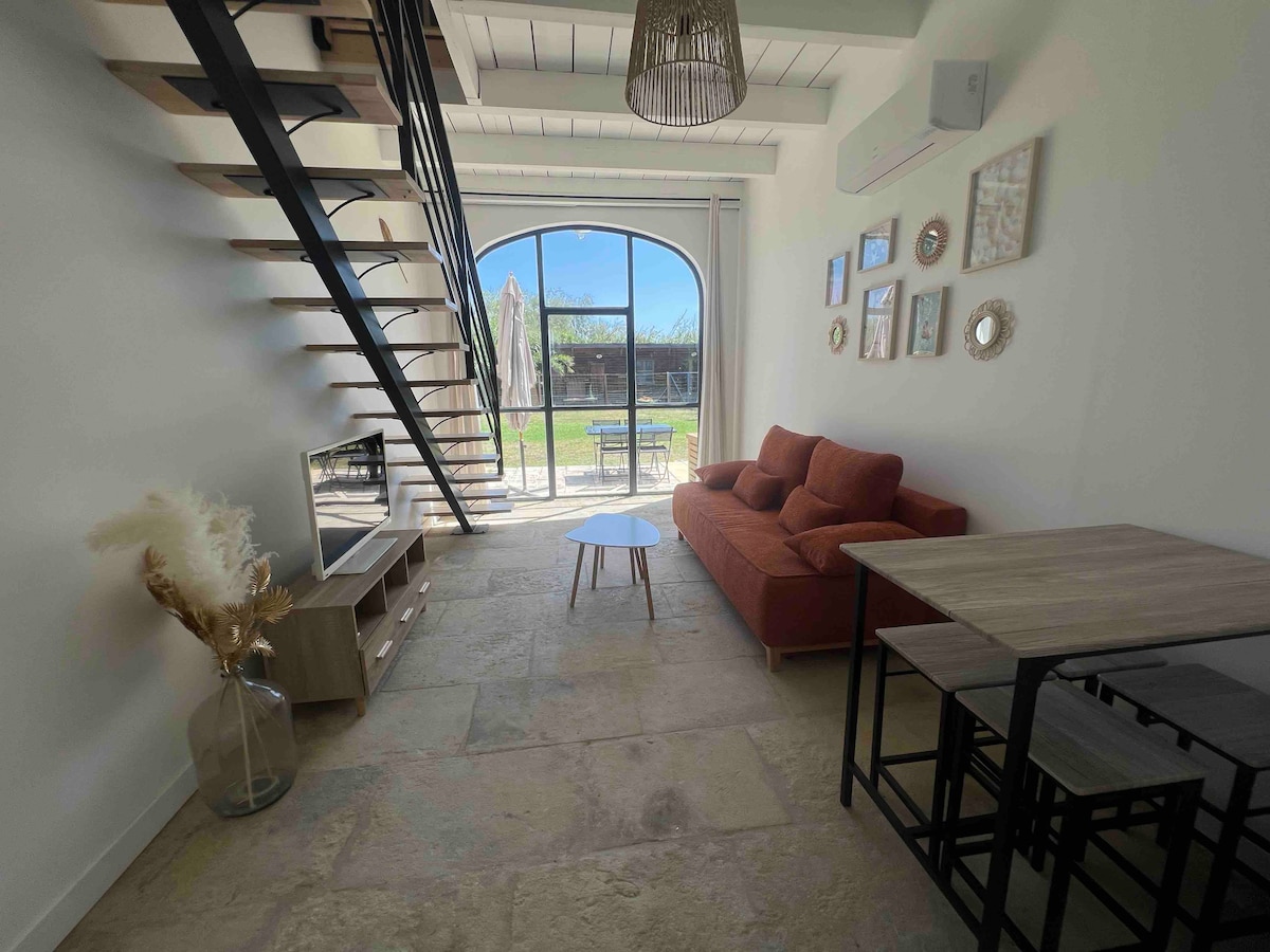 Entièrement rénové, ce loft moderne est composé de 2 chambres, une avec un lit double en 180 et l'autre avec 2 lits simples. Une grande cuisine entière équipée ouverte sur le salon avec cheminée et donnant sur une grande terrasse privative close et sans vis à vis. Vous pourrez profiter de l'espace piscine qui comprend une grande piscine mais aussi une pataugeoire pour les plus petits, d'une cuisine d'été avec bbq au gaz et brasero Nous sommes situés à la campagne et un véhicule est nécessaire.