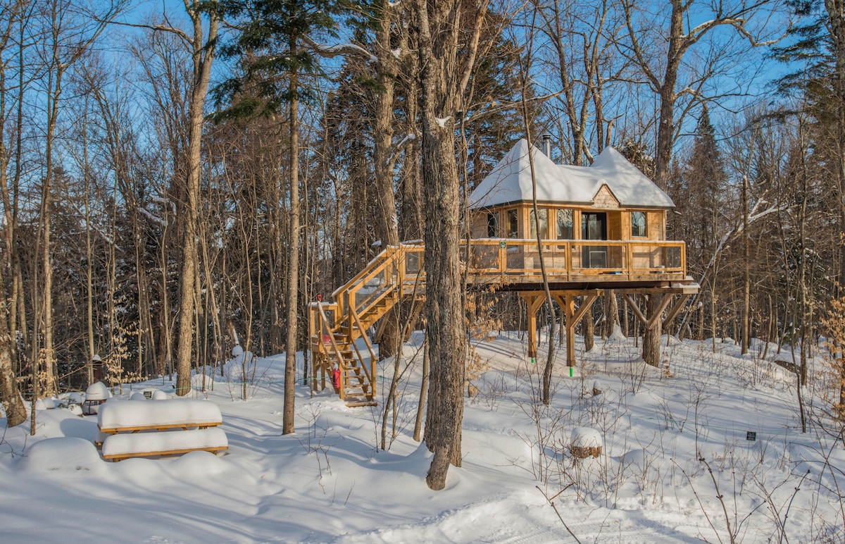 We hope to fulfill your treehouse fantasy. The treehouse is a unique minimalist experience for those seeking quiet solitude in the Gatineau hills. Includes all the amenities of home to offer the most comfort in all seasons. Walking distance from Le Belvedere wedding reception centre. One of a kind hand hewn log treehouse is an inspiring and tranquil nature retreat. Establishment CITQ number: #295678