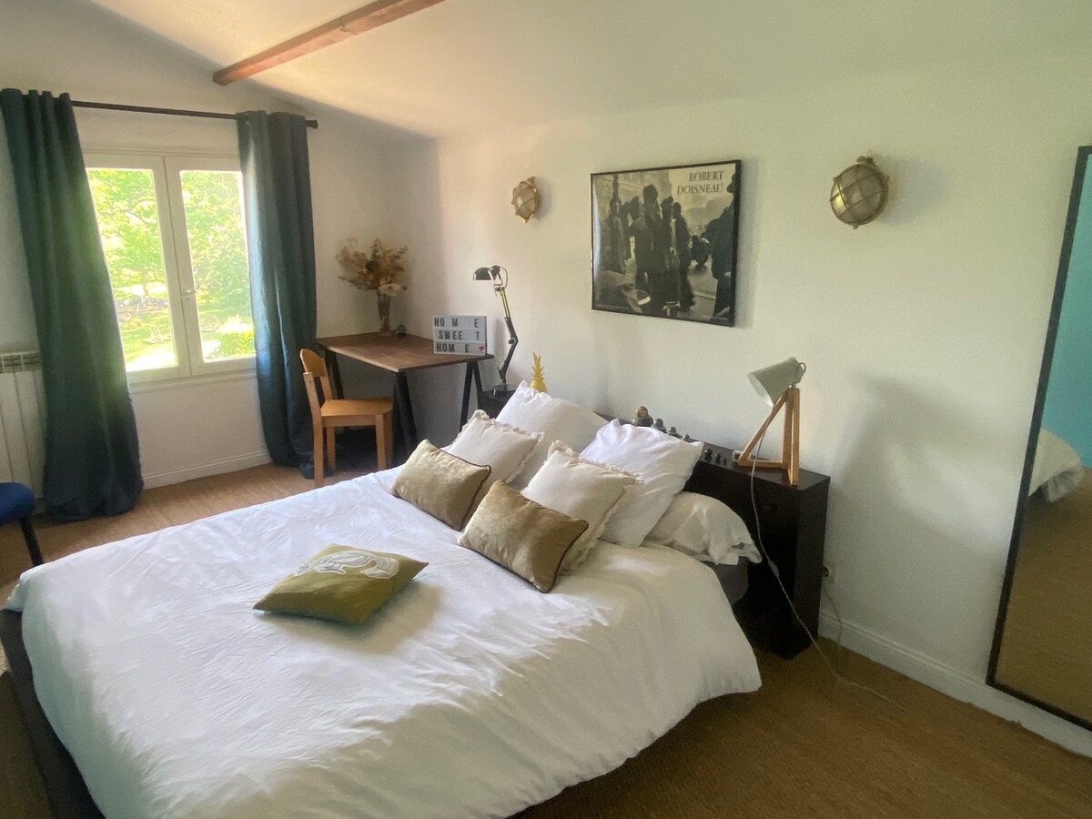 Venez vous reposer au frais à la campagne dans un cadre tranquille pour profiter de la nature. L'appartement fait 40m². Une grande pièce de 30m² avec coin chambre, coin salon et kitchenette. Salle de bain avec douche et toilettes. Entrée indépendante et parking facile et gratuit devant notre maison. Il m'est impossible d'enregistrer l'adresse sur le site alors la voici : 15 allée des Camélias à celles sur belle en face du cabinet vétérinaire, non loin de l'église