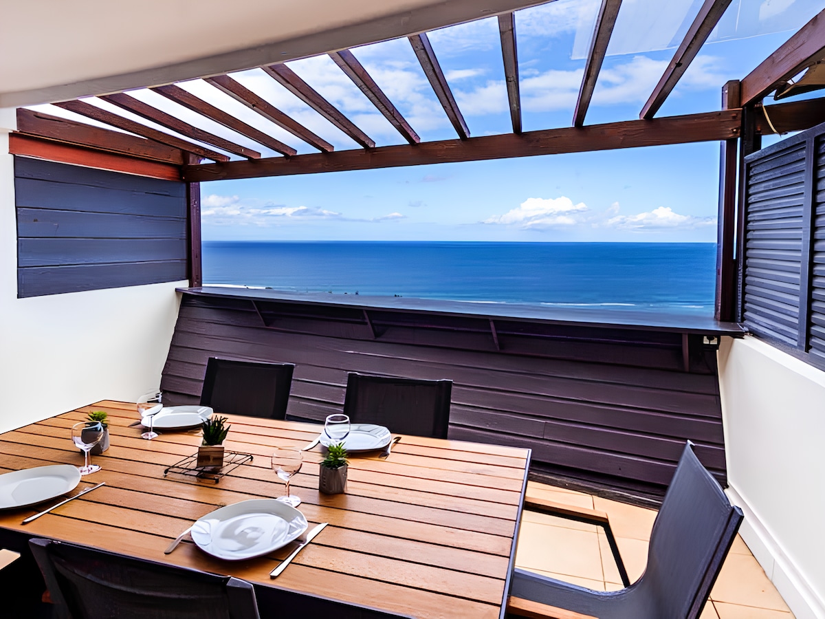 Le Pétrel Vert is located facing the Indian Ocean, with direct access to the small Turtle Beach. It is at the entrance of Saint-Leu, just a few steps from Kélonia, the famous sea turtle rehabilitation center. The apartment offers its guests a soothing view of a garden and the sea, with splendid sunsets.