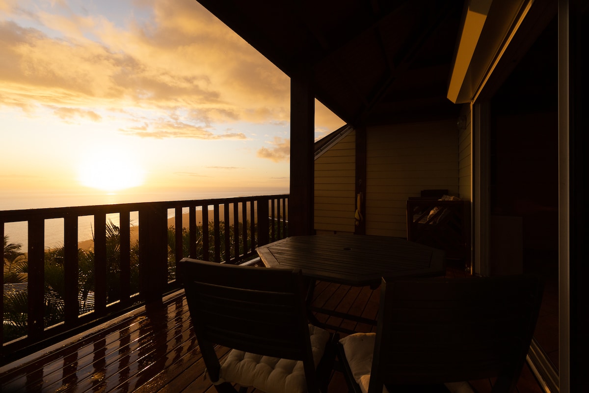 Chalet 70 m² entièrement équipé, véranda avec vue sur mer, lumineux, confortable, salon spacieux, et chambres climatisées. Il offre une belle vue sur l'océan ou l'on peut observer les couchers de soleils quotidiens et les passages de baleines en saison. Situé à 100 m d'altitude dans un quartier résidentiel calme et arboré, à 3 min (en voiture) du centre ville de Saint-leu et ses plages et à 15 minutes de l'autoroute, il dispose d'un parking privé pouvant accueillir une voiture.