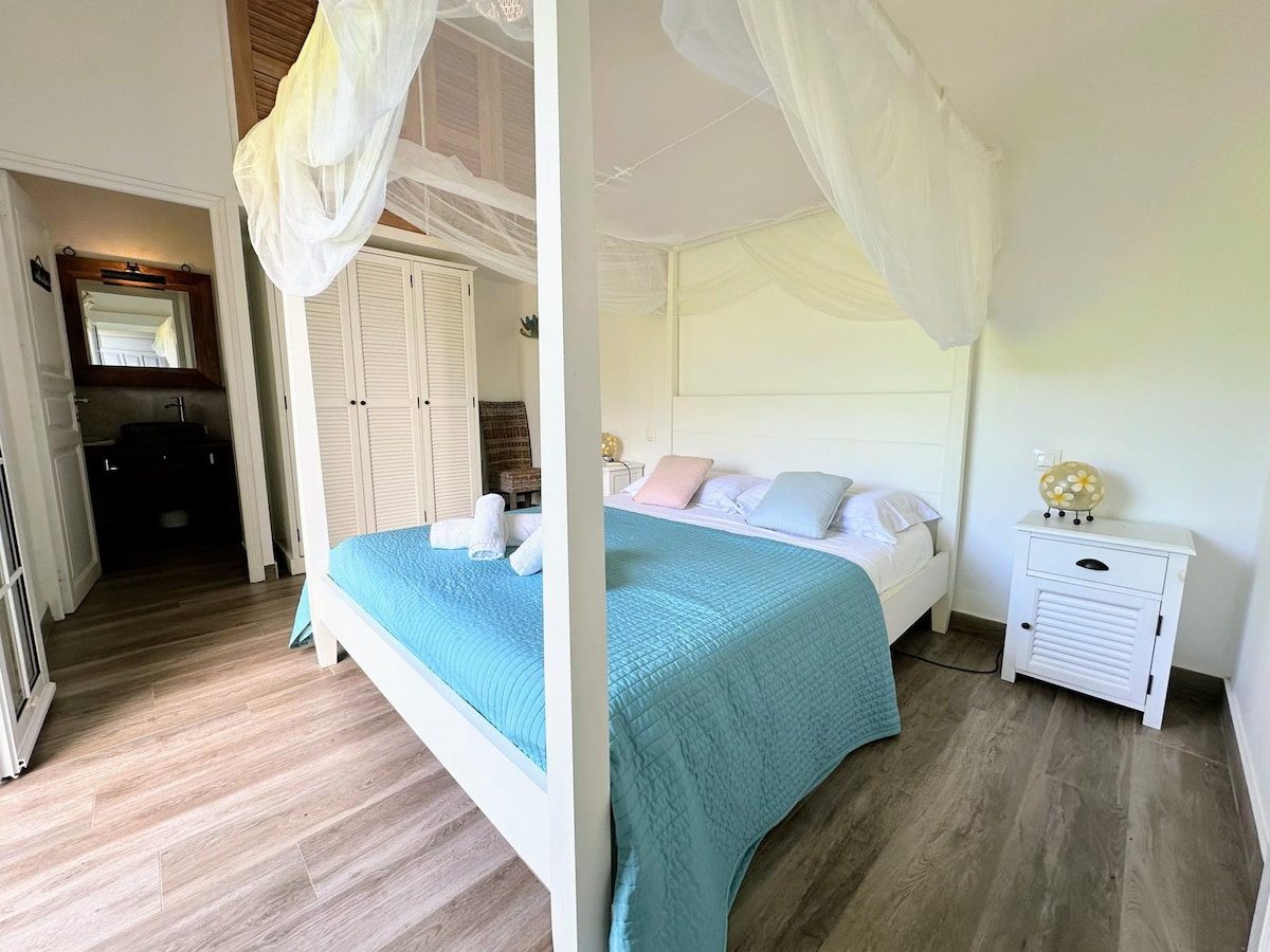 Appartement de charme, tout confort, à la décoration raffinée et élégante, au 1er étage de notre villa, sur terrain arboré dans un environnement calme, sur une colline entre mer et montagne. Vue imprenable sur la baie des Saintes. Parfait pour 4 personnes ou un couple avec enfants. A 45 min de l’aéroport, 5 min de l’embarcadère pour les Saintes et le départ de la randonnée de la coulisse. A 10 min des sources chaudes de Dolé, de la plage de grand Anse (sable noir). A 15 min des chutes du Carbet