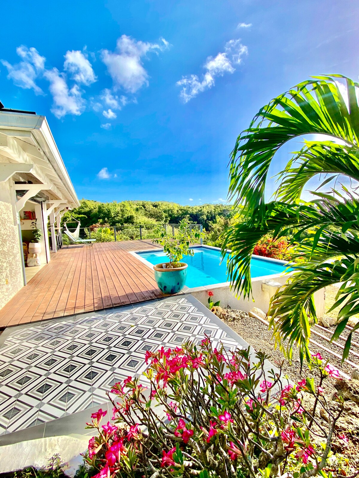 Magnifique villa vue mer à 180 degrés. Plein sud, vue sur la Dominique et les Saintes. Bellle piscine carrelée entièrement sécurisée ainsi qu'un jacuzzi. Agréable jardin tropical parfaitement ventilé par les alizés. Située dans un lotissement très calme en haut du morne à 2km au dessus de Grand Bourg, emplacement idéal pour profiter de cette île merveilleuse.