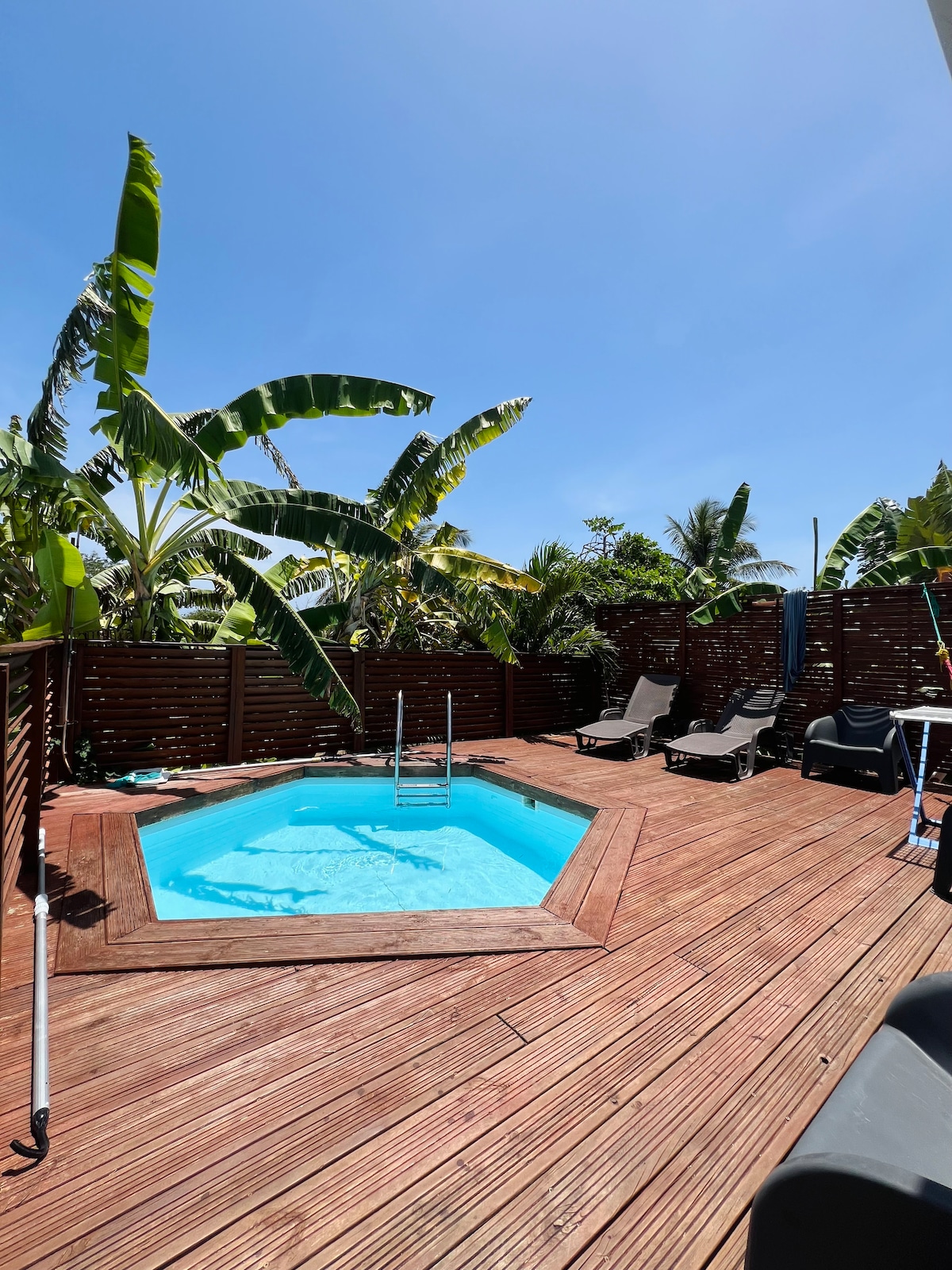 Jolie villa construction en bois, dans jardin tropical, situé à 5 mn des magnifiques plages de St Louis offre tout le confort, sans vis à vis Louée avec 1, 2 ou 3 chambres Toutes les chambres sont climatisées, équipées de lit King size de 160x200 avec douche italienne et wc. Cuisine américaine toute équipée, nespresso Vous profiterez d'une grande terrasse avec une piscine PRIVATIVE de 8X4, le tout clôturé par une végétation verdoyante sans vis a vis, pour de merveilleuses vacances!!!