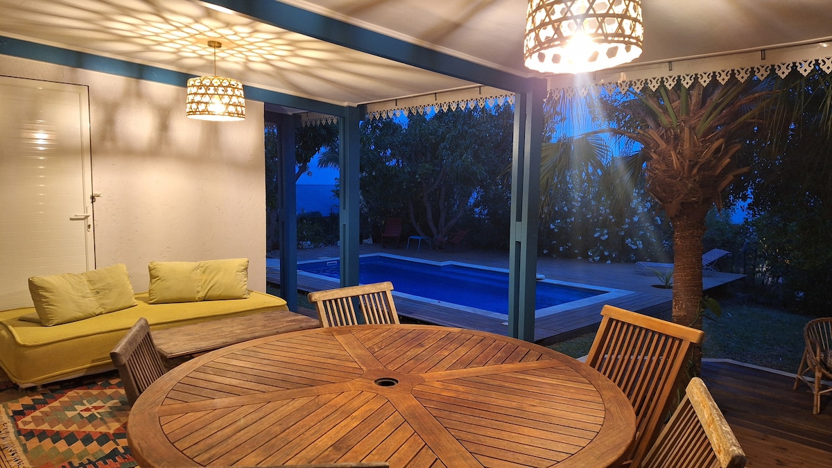 Magnifique villa de luxe avec vue sur la mer à 180°, et vue sur la montagne. Elle est équipée pour recevoir 6 personnes confortablement. Sa situation calme et paisible, vous permet d'accéder facilement vers le centre-ville de Petite-Ile, vers la plage de Grand-Anse, vers la ville de Saint-Pierre, et vers le sud sauvage. Une grande piscine au sel vous permettra de vous relaxer quand vous le souhaitez que ce soit en journée comme en soirée après vos excursions dans l'île.