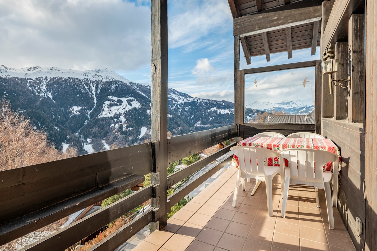 Bright 3-room apartment in a small chalet of 3 dwellings at 5 minutes walking distance from the funicular and the village centre. Drop off your car at your arrival on the included parking spot, no need anymore. You have a breathtaking view of the peaks of the Val d'Anniviers from the terrace. Ideal for 4 people, possible up to 6 (2 extra beds for children). Kitchen, windows and heating completely renovated for optimal confort.