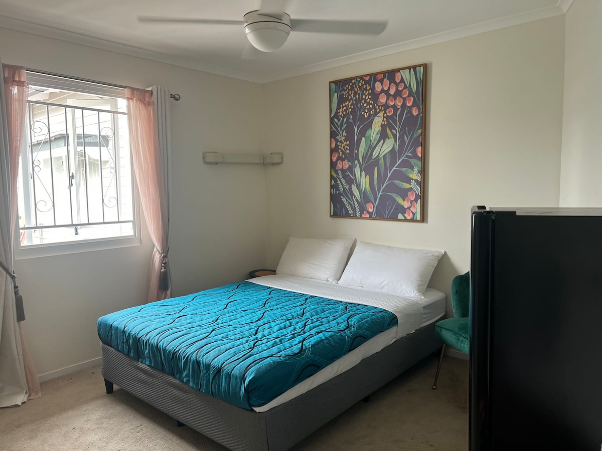STUDIO & AMENITIES Access: Private gated entry & parking Living Space: Self-contained studio featuring Queen bed, AC & ensuite. Outdoor: Includes Private deck. KITCHEN Appliances: Fridge, microwave, air fryer, kettle, toaster. Supplies: Full set of cookware, tableware. LOCATION Setting: Quiet residential area near parks, bus stops. Proximity: 2 mins to local dining/ shopping; 15 mins Garden City Westfield Mall. Travel: Easy motorway access -25 mins Brisbane CBD; 35 mins Gold Coast THEME PARKS.