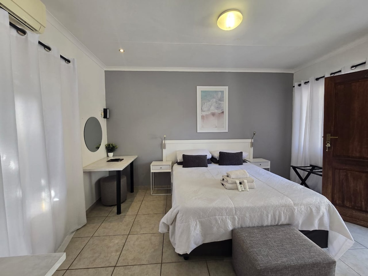 Very well equipped budget rustic self cater flat in a garden setting. An old house changed into separate units. 6 Steps to the only door. Lots of windows, light. Next to the swimming pool and a communal path and own bbq (braai) and garden furniture. Small bathroom through the kitchen ( basin toilet shower). Gas stove. Ceiling fans only. 1 Large bedroom. Lounge & dining. Appliances, furniture and decor vary ( new, old, handmade bought) items. NOT modern but simple & functional arty. No TV.