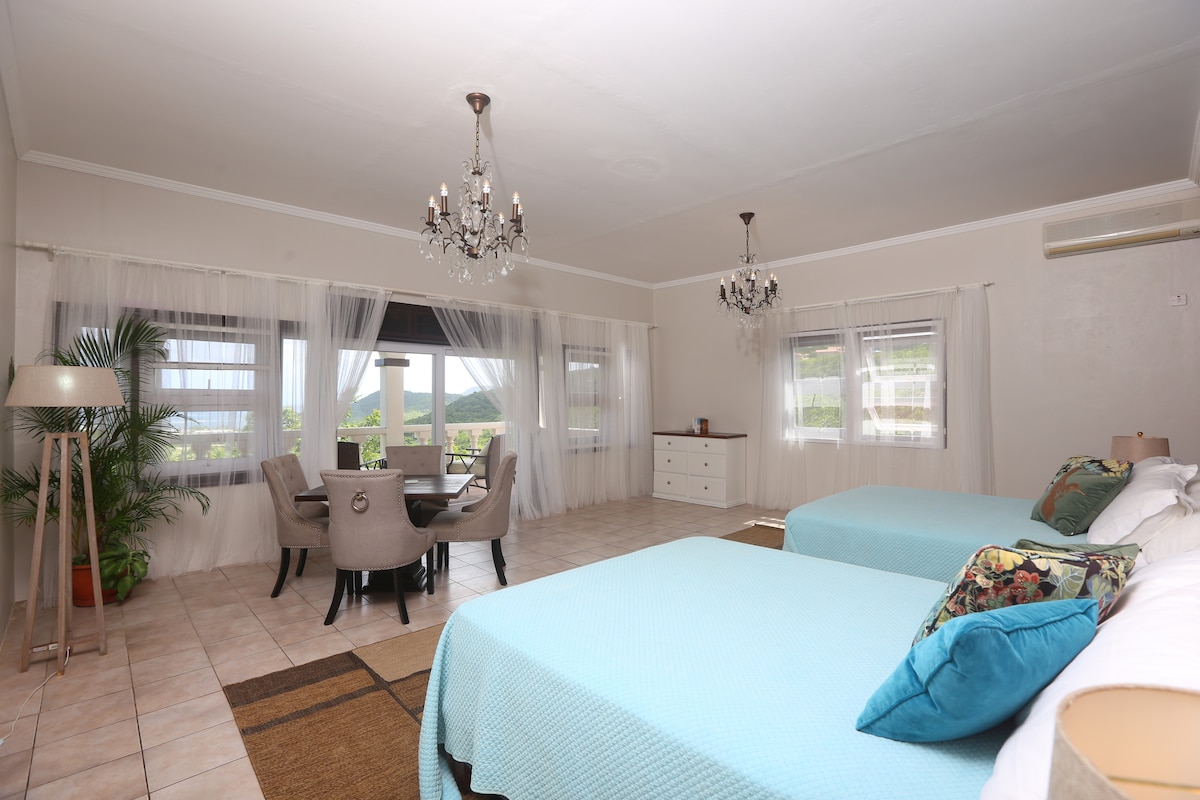 One of 3 suites (see my profile to view other suites) within our family home, located on 4 tropical acres of land with magnificent views of the north and the neighboring island of Martinique. Enjoy the most amazing sunsets on the sprawling patio. Despite its tranquility, the property is ideally located less than 10 min drive from the city, and some beaches. A 2 min walk up our driveway and you're on the bus route. Within a 10 min walk are a bakery, mini mart, bars, restaurants and food vans.