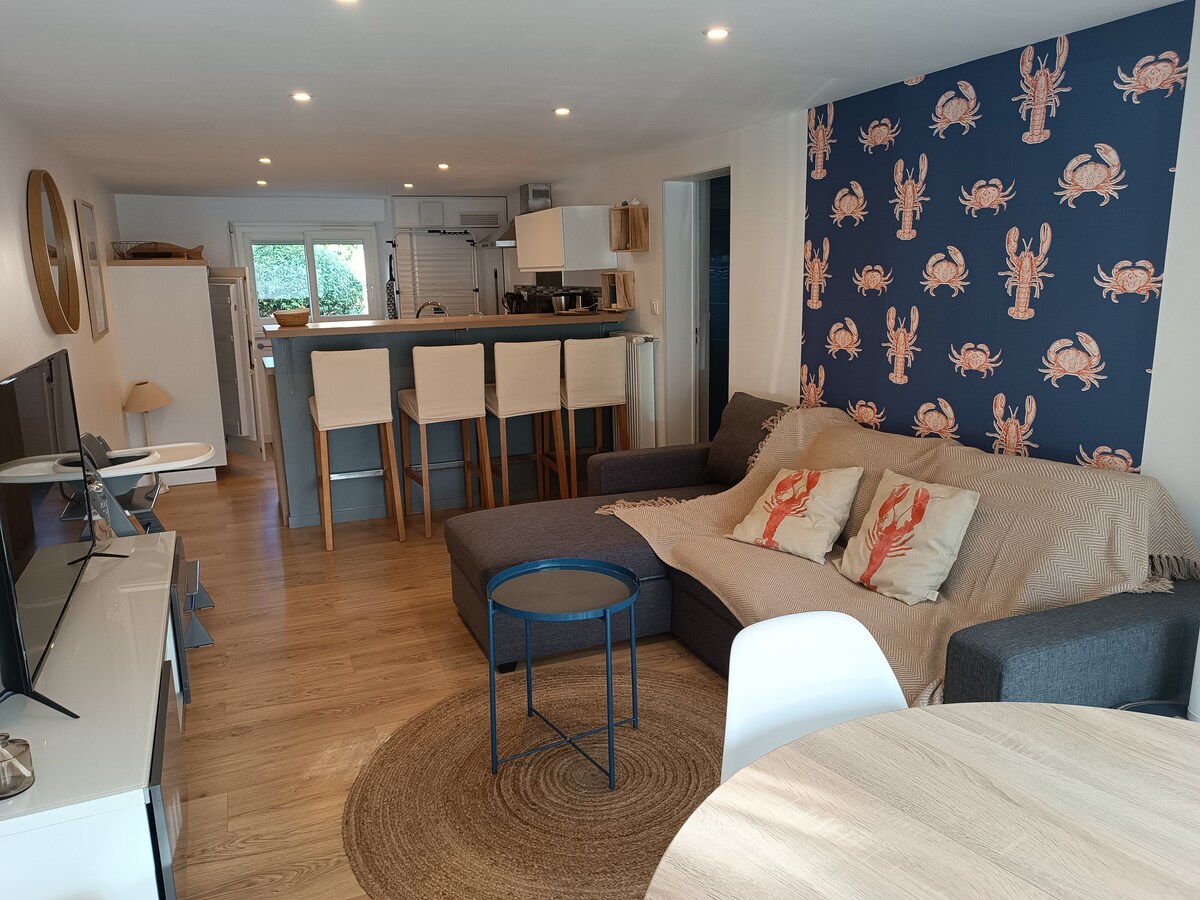 Bel appartement entièrement rénové (70m2), sur la digue, lumineux avec vue mer dans toutes les pièces. Location à la semaine pour 3 personnes en période de vacances. Au rdc : 2 chambres avec 3 lits Grand séjour et salle à manger avec Véranda vue mer et jardin privatif, TV et accès internet. Cuisine américaine entièrement équipée. Salle de bain de standing Accès direct à la plage Proximité à pied des commerces et marché (5min) GARAGE privatif sur réservation en option (12€/jour)