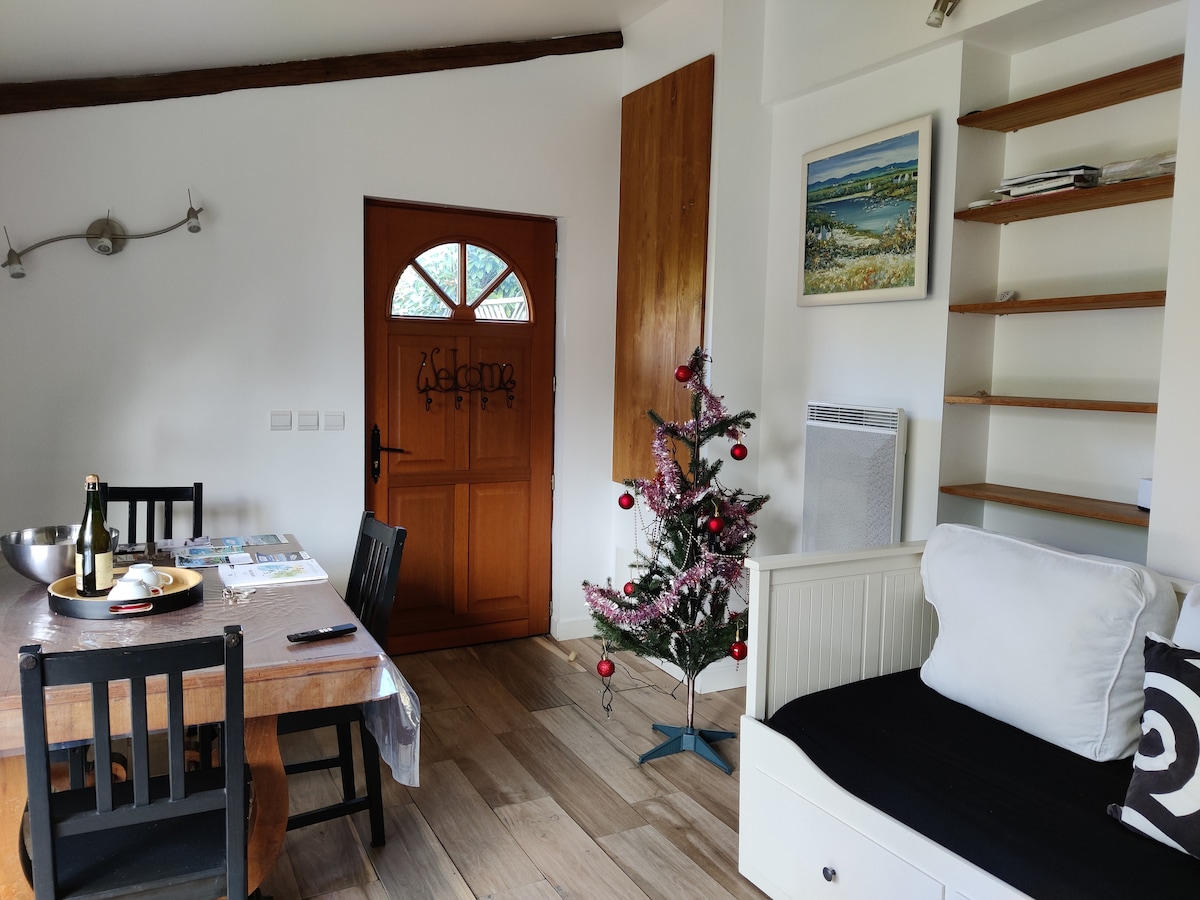 Logement 2 pièces neuf, décoration soignée, bel espace de vie exposé plein sud, ouvrant sur terrasse sans vis à vis. -Cuisine aménagée et équipée, Salon avec canapé et tv, 1 chambre lit double avec dressing, 1 salle d'eau avec douche à l'italienne et lave linge, 1 wc séparé. -Terrasse bois, avec salon de jardin, parasol et barbecue. Terrain bien exposé, aménagé et clôturé. Accès privatif incluant une place de parking intérieure.