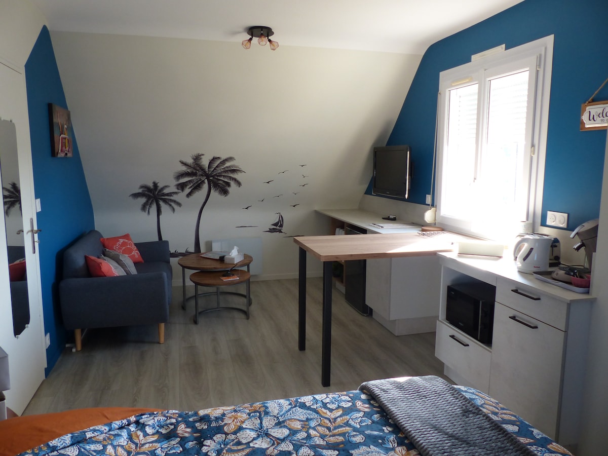 Studio spacieux avec espace nuit, coin salon et kitchenette dans cadre calme et agréable au sein d'un ancien corps de ferme rénové. Grand lit Queen Size 160. Kitchenette. Idéalement situé Terrasse Wifi Parking Privé Local vélos Idéalement situé au coeur de la baie du Mont Saint Michel