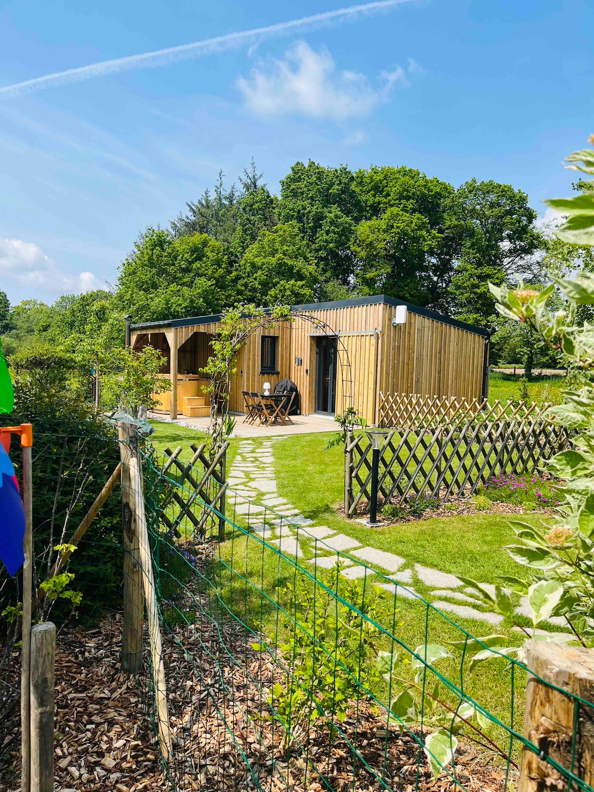 距离迪南5分钟的小屋,花园一侧的北欧浴缸