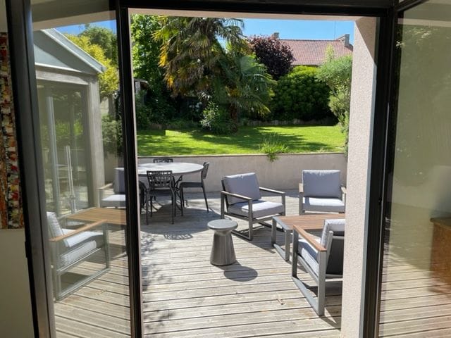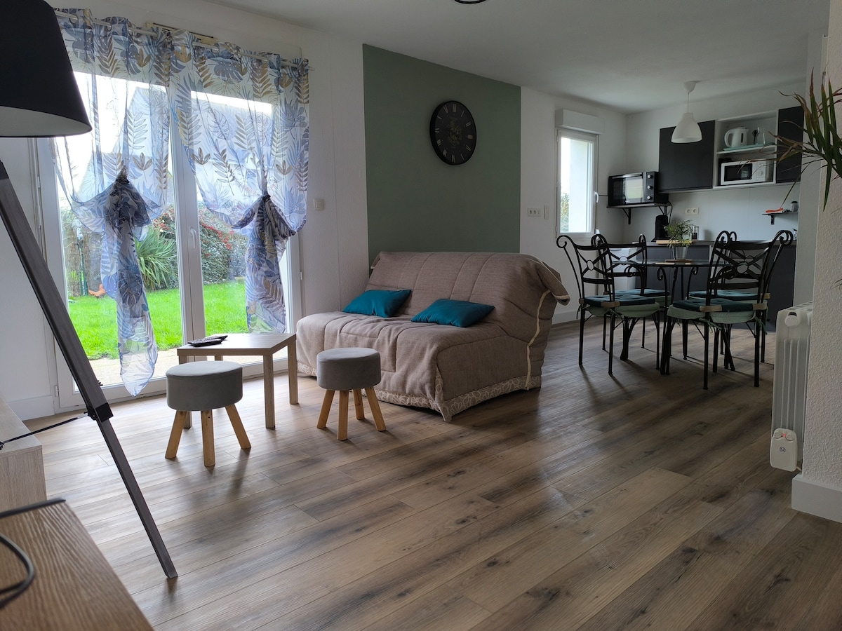 Cette charmante maison peut accueillir 5 voyageurs et 1 bébé. Le logement se compose de la manière suivante : Au rez-de-chaussée - Une pièce de vie avec TV, canapé, fauteuils - Une cuisine équipée. - Chambre 1 : avec un lit double (140×190) - Une salle d'eau avec douche - Un WC séparé A l'étage : - Chambre 2 : avec un lit double (140×190) - Chambre 3 : avec un lit simple (100x190) Extérieur : - Un beau jardin clos de 350 m² - Une terrasse de 9 m² avec mobilier pour profiter des beaux jours.