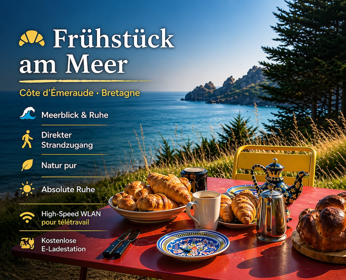 🌊 Vue mer frontale • accès direct plage 🌿 Domaine privé RozVen • calme, nature préservée 🇩🇪 Direkt am Meer • freier Meerblick • ruhig 💼 Télétravail • fibre >1 Gb/s 🔌 Recharge voiture électrique gratuite 🍽 Coquillage (3★ Michelin – Roellinger) · 10 min 🦪 Huîtres de Cancale · fruits de mer 🏡 Villa de Colette – maison indépendante 🌳 Parc privé 4 ha face mer 🛏 3 chambres • 2 à 6 pers 🌅 Terrasse vue mer
