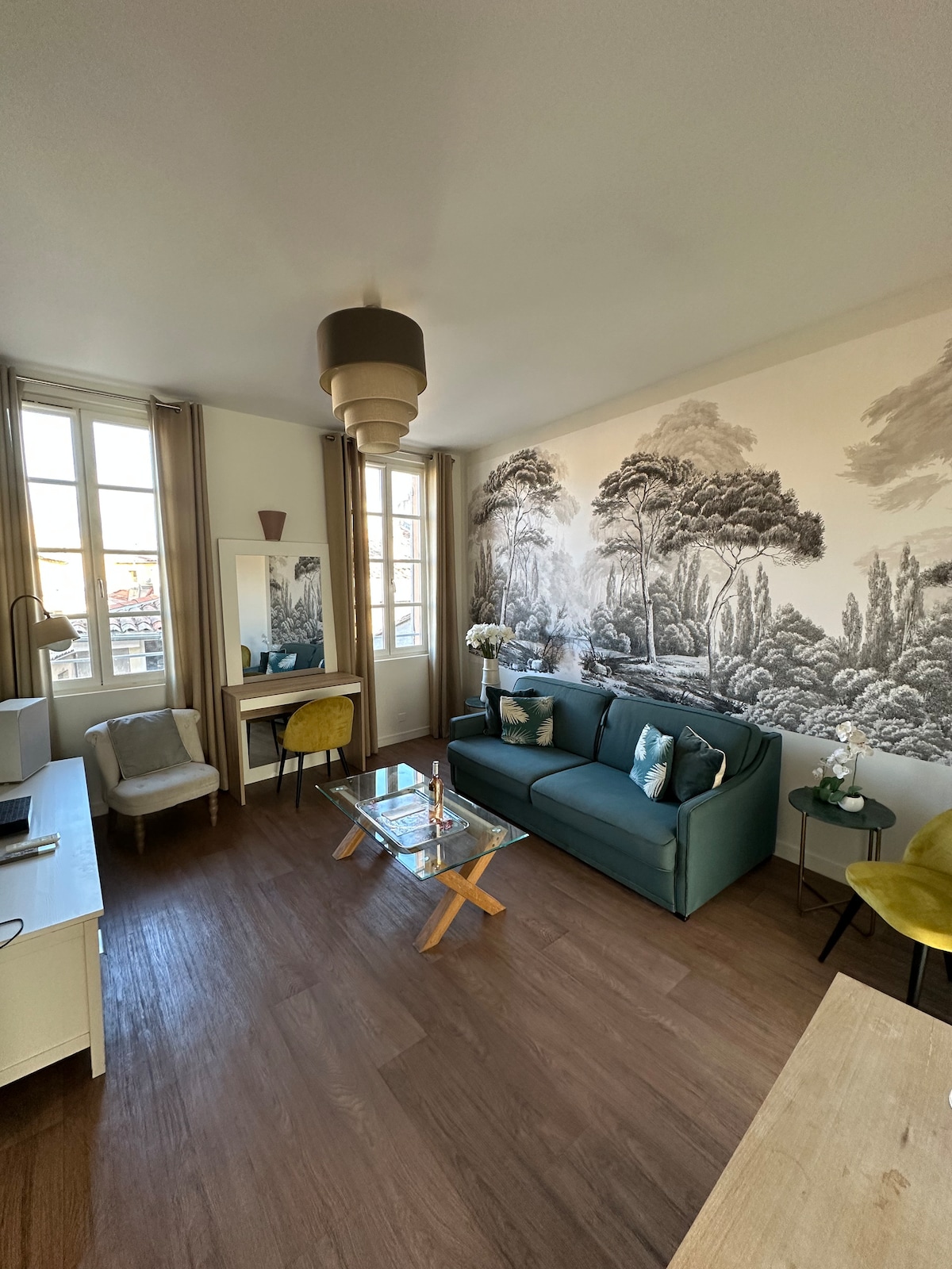 The apartment is located on rue cardinale, one of the prettiest streets in Aix-en-Provence, in the heart of the Mazarin district, in a quiet location close to shops and the city's main cultural attractions. This is a character apartment with high ceilings and period furniture. It is on the 2nd floor with elevator and benefits from double exposure, air conditioning and all amenities..