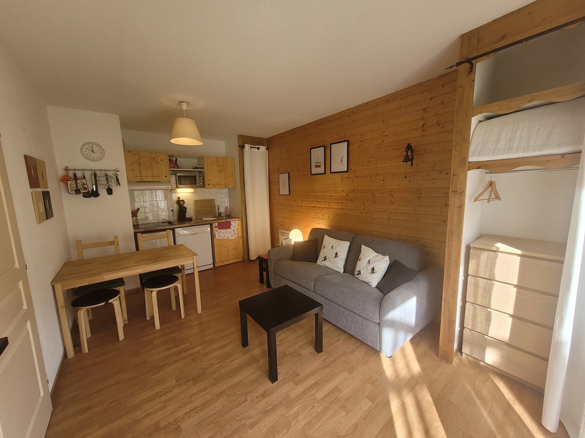 舒适的单间公寓,25平方米,滑雪进出,提供床上用品,包括床铺