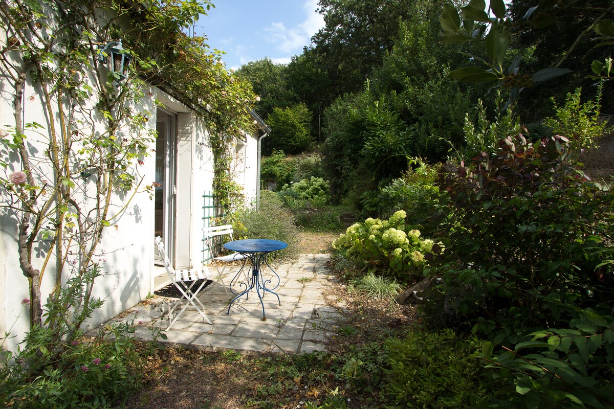 "La Blandinière" Maison de charme, entièrement rénovée, 45 m2 Dans un écrin de verdure et au calme. A deux pas de la Loire. A l'étage une chambre avec un grand lit, salle de bain, WC. En rez-de-chaussée, une pièce avec le charme des maisons anciennes comprenant un espace cuisine, salon avec canapé, table, télé, wifi. Barbecue, salon de jardin, transats, vélos. A proximité : golf, randonnée pédestre et équestre , visites de caves, canoë, marchés , pêche, VTT, musées, châteaux.