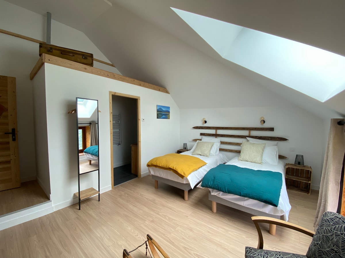 Entre lac et montagne, un endroit paisible avec jacuzzi et vue exceptionnelle à 180° ! Votre chambre spacieuse comporte un lit de 160, une télévision et un bureau. La salle de bain et les toilettes séparés sont au même étage, qui vous est dédié. Linge fourni. Au rdc, le petit-déjeuner (+ 12€ /pers.) est servi dans la véranda, particulièrement agréable, ou sur la terrasse. Le soir, vous pourrez avoir un accès partagé à la cuisine, au salon avec télévision et cheminée, ainsi qu'à la terrasse.