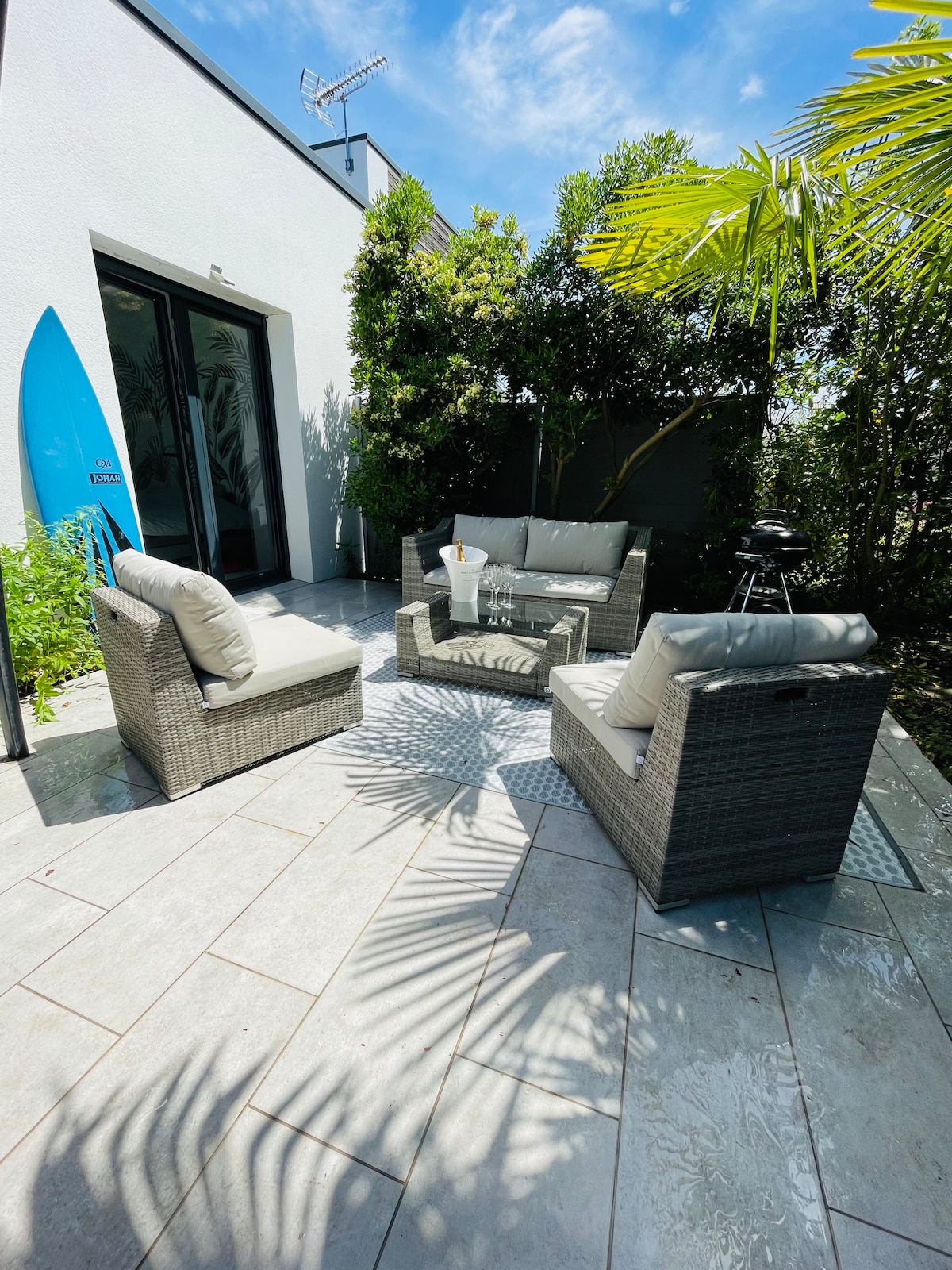 Détendez-vous dans cet espace calme et élégant. Appartement 33m² attenant à la villa, jardinet privatif équipé de son mobilier. Stationnement dans la propriété. Idéalement situé, proche de tous commerces et Super U Plages 8 km avec navette gratuite en été. Surf, randonnées Landes ou Pays Basque etc... Bayonne Biarritz 10 mn, Espagne 35 mn, Capbreton Hossegor 20 mn. Lignes de bus. Pas de frais de ménage, l'appartement doit être rendu propre : cas contraire forfait 35 € Draps et linge fournis