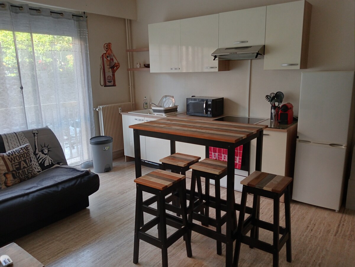 endroit paradisiaque, jolie 2 pièces prés de la plage du Golfe Bleu, avec une belle terrasse arborée de plantes exotiques et vue sur "le rocher de Monaco". rez de chaussée d'une maison avec entrée indépendante et accès direct par chemin vers la plage. . 3 min à pieds de la gare SNCF. place de parking facile, quartier résidentiel et calme, très romantique et idéal avec petits enfants. L'appartement est équipé de "CLIMATISATION" et "WIFI", télé cable ,cuisine équipement complet bonnes vacances.