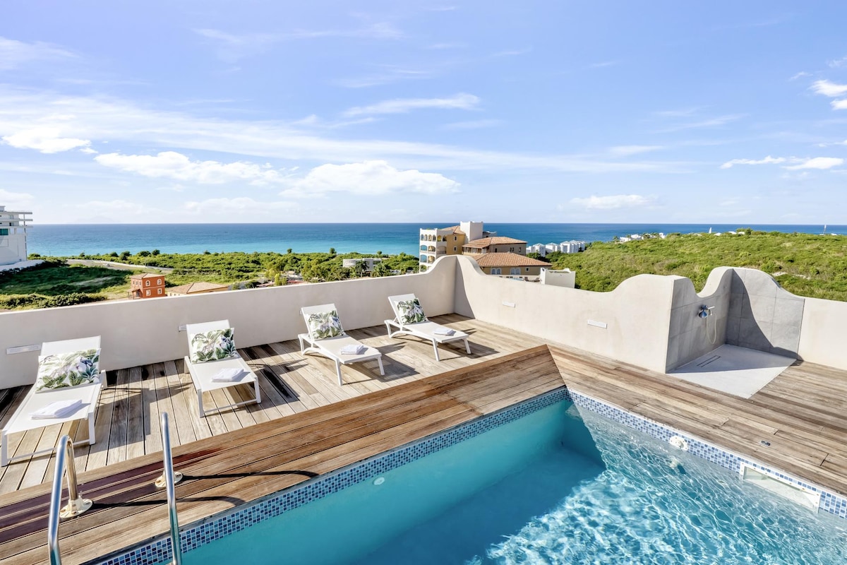 Treat yourself to the utmost stylish and modern ocean view apartment located in the exclusive Little Bay Hill . This spacious environment, is designed to be enjoyed as a family, has a terrace with stunning sea views, private pool, one master suites ( Japanese king bed and a walking closet), one bedroom suite with two twin size beds ( could be converted to king size bed ) . Welcome to Terraces Little Bay !
