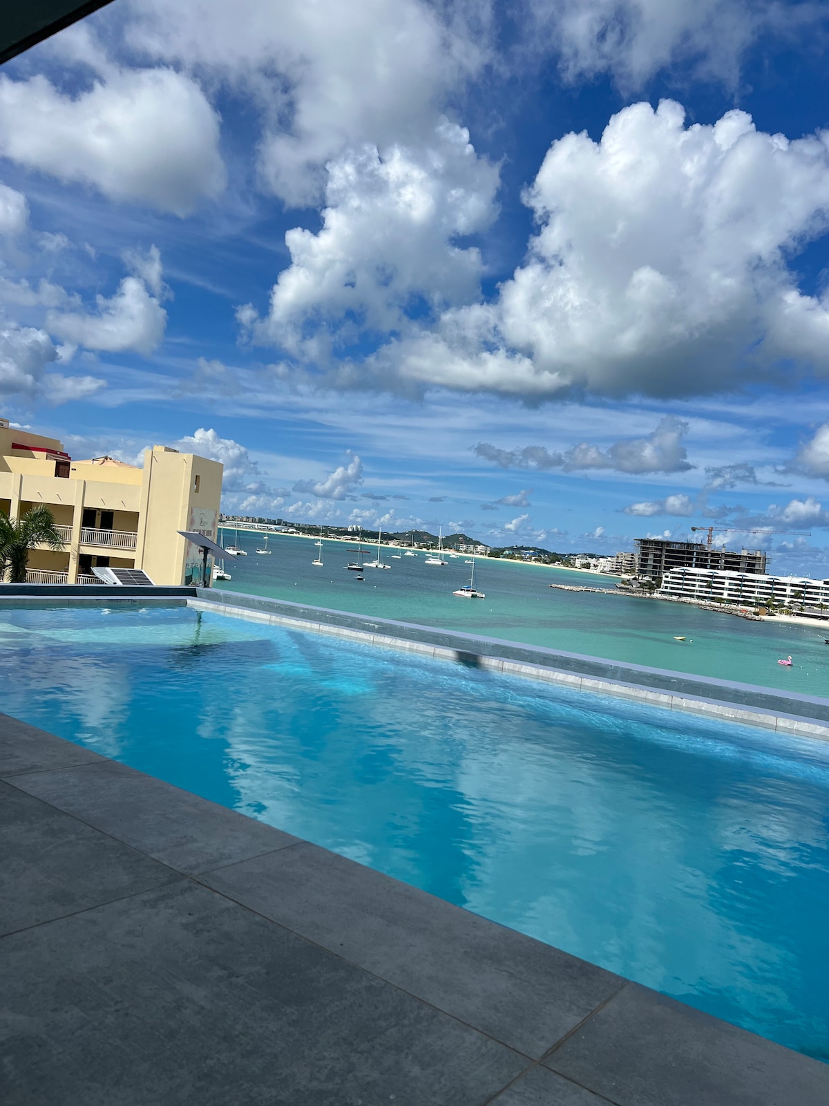 Wake up to the magnificent panoramic view of the lagoon on the top floor, rejuvenate your body with a refreshing dip in the private rooftop infinity pool with a coffee or tropical drink. Take a 10 mins stroll to the famous Mullet bay Beach and grab a few freshly French croissants by the Square. After sunset, enjoy the plentiful neighborhood bars and restaurants or take 5 mins drive to Maho where you will find a vast variety of restaurants, casino and clubs or Porto Cupecoy for romance spot.