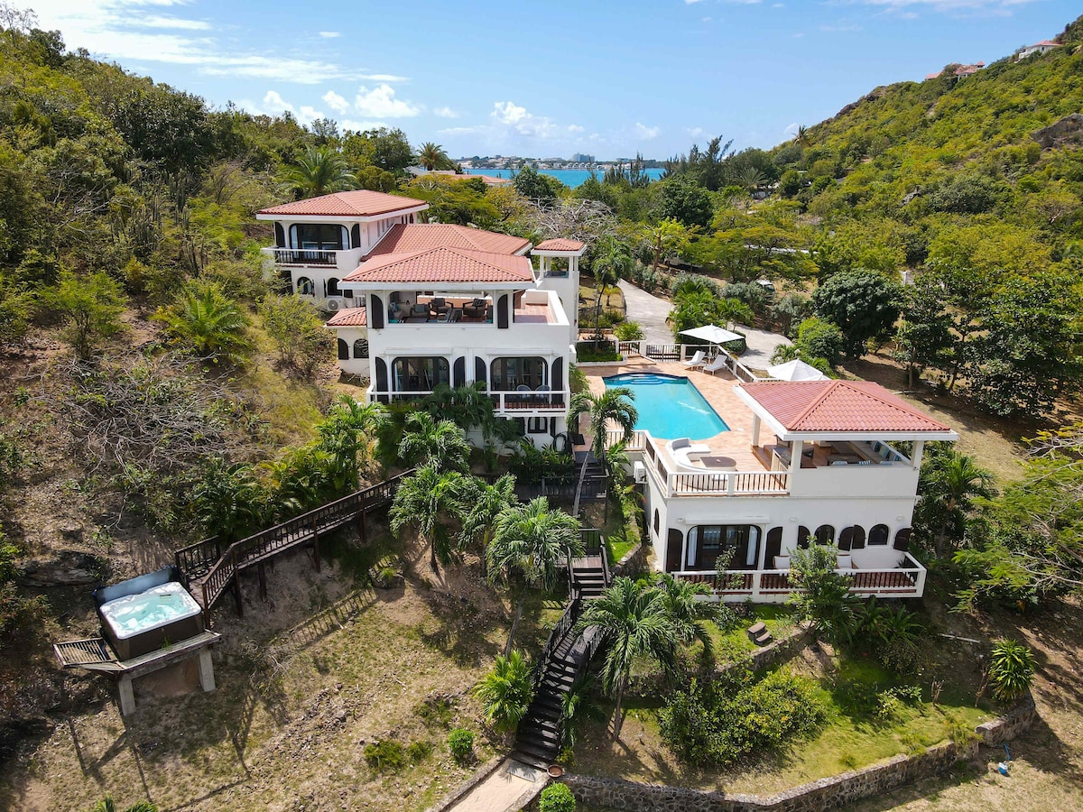 La villa VOGUE ART cadre LUXUEUX - quartier SECURISE. ⭐️Un service de ménage d’appoint quotidien ⭐️Concierge je m occupe de tout ( chef, bateau, massage, yoga....) Vue mer panoramique sur Pinel island, Saint-barth. 🏝️ 5 chambres spacieuses, 5 de salles de bains et 6 toilettes privatifs. 🏝️ espace de séjour généreux avec 3 canapés, tv avec chaînes internationales 🏝️ cuisine équipée HAUT DE GAMME 🏝️ immense piscine CHAUFEE 🏝️deux terrasses panoramiques pour se détendre