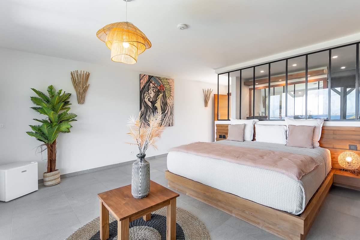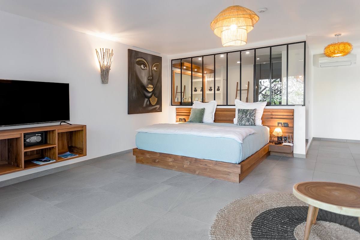 Le paradis au pied de l’océan! Studio neuf de 50m2 climatisé équipé d'1 lit king-size, 1 canapé convertible, 1 grande TV et 1 bureau. La terrasse avec mobilier moderne offre une vue mer imprenable avec un accès direct à la piscine et la plage. kitchenette moderne incluant le lave-linge; Parfait pour un séjour confortable raffiné et inoubliable sous le soleil des caraïbes.