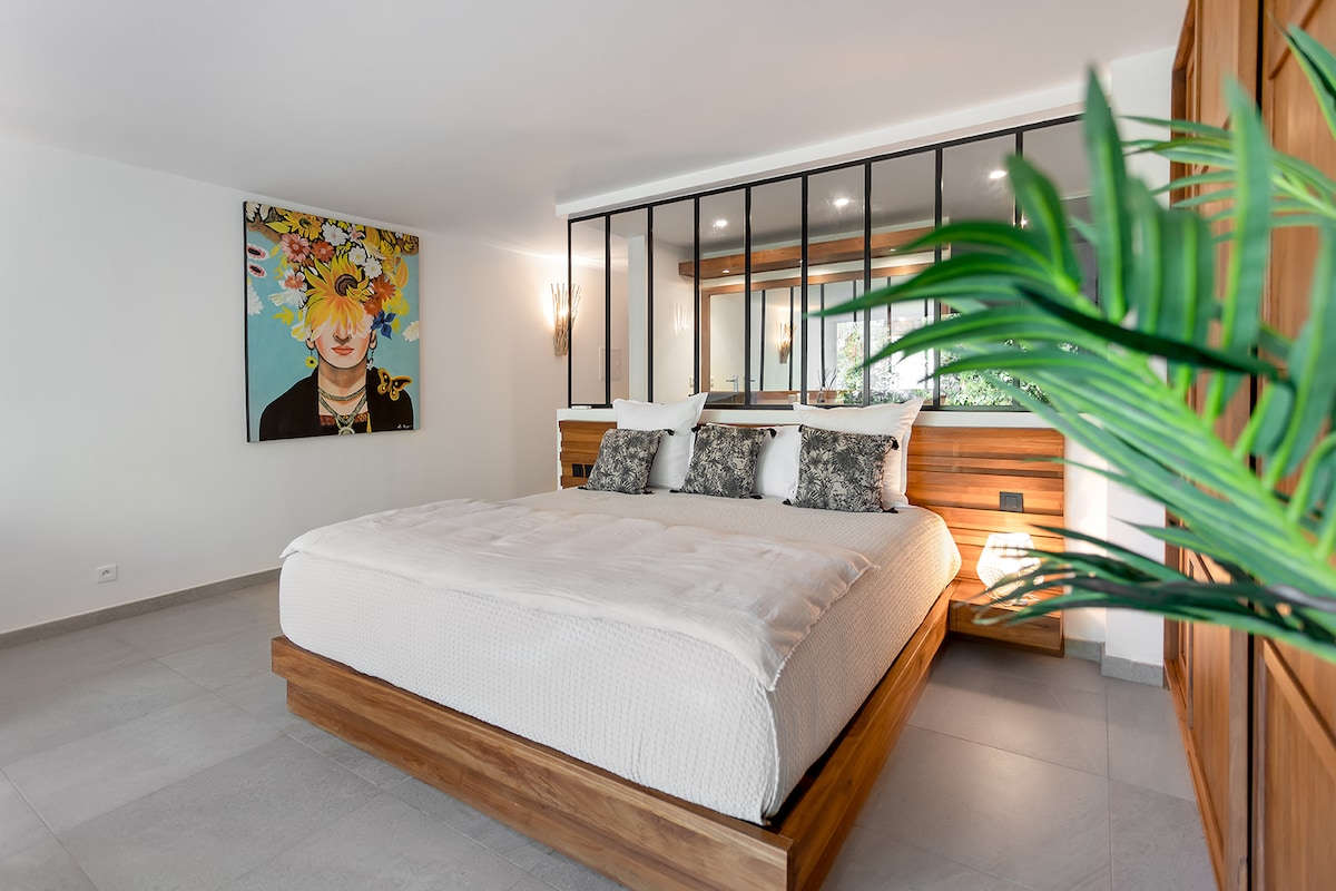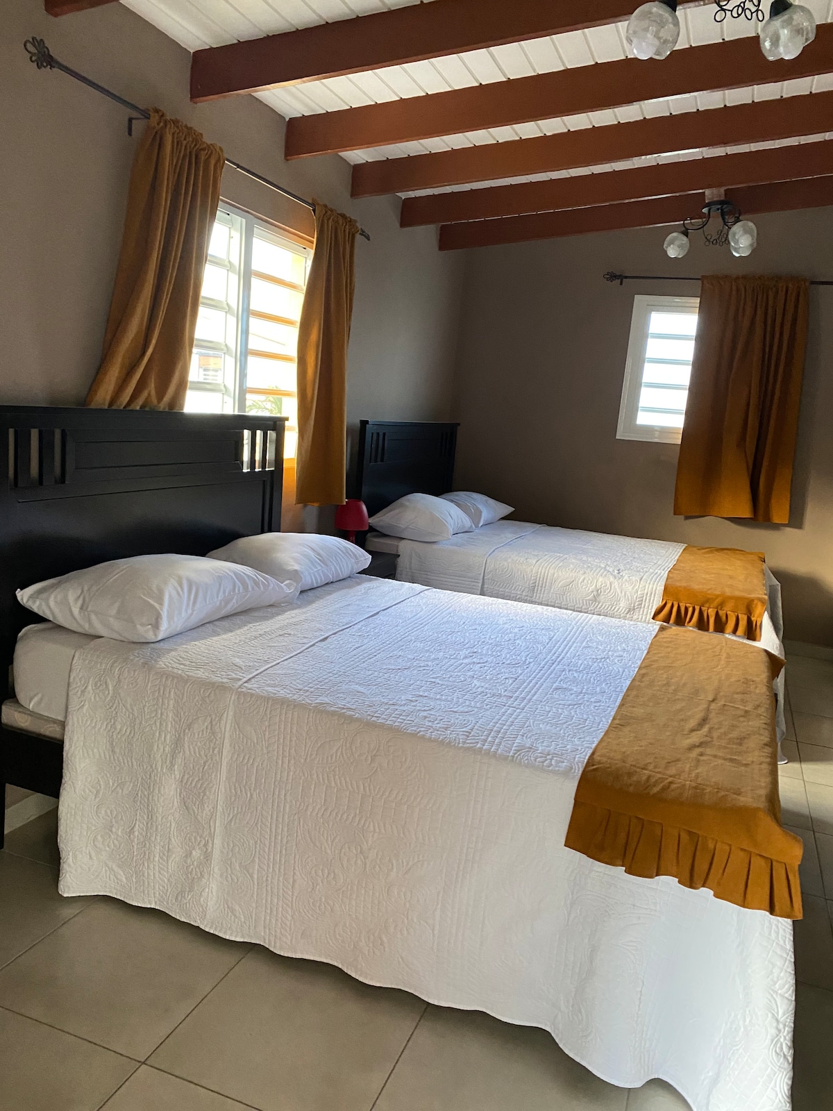 Duplex clair et lumineux dans une propriété privée, à l'entrée du Parc de la Baie Orientale, route de la plage. Niché au coeur d'un jardin tropical avec piscine, un séjour au calme et tout près des animations (nautiques, sportives et nocturnes).