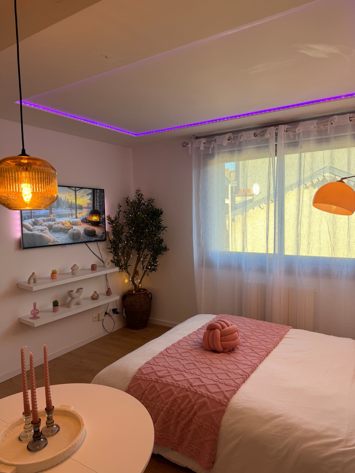 Ce logement affiche un style résolument unique. Un Appart de haut standing pour des moments de détente et d’intimité dans un contexte luxueux. Un salon ouvert sur cuisine équipé avec vidéo projecteur géant et un home cinéma pour être en total immersion lors d’une soirée Chill. Chambre spacieuse avec un lit QueenSize (160x200) confort assuré. Une salle de bain luxueuse avec douche a l’italienne comprenant un jaccuzi 3 personnes et un sauna pour 3/4 personnes avec accès direct à la chambre.