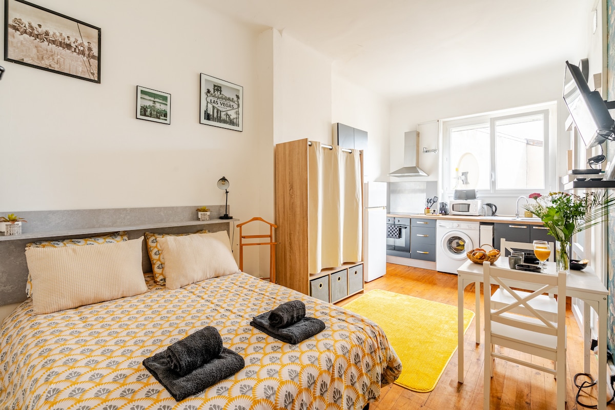 Studio indépendant au Rez de chaussée d’une villa moderne Appatement Studio neuf de 30 m2 Salle d’eau avec belle douche Italienne Grand lit 160 pour 2 Petite cuisine kitchenette Frigo Canapé lit pour une personne plus un lit tiroir Dans une rue calme Quartier résidentiel Une belle place de stationnement juste devant la maison Proche des commerces A 15 min à pied de la gare Proche de St Alban ( centrale ) Cinéma à 2 min en voiture Nombreux restaurants Télévision Wifi Machine à café