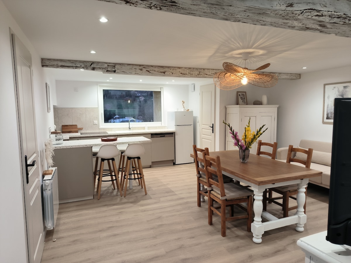 Ravissant logement indépendant en pierre, lumineux et rénové avec gout. Entrée sur la pièce salon avec canapé lit et cuisine toute équipée frigo congélateur plaque cuisson four micro-ondes cafetière bouilloire ustensiles de cuisine. Escalier japonais qui mène à la chambre et une salle de douche avec toilettes.Vous pourrez profiter d'un espace extérieur avec une table chaises et transats. Une grange est à votre disposition pour vos vélos, motos ......