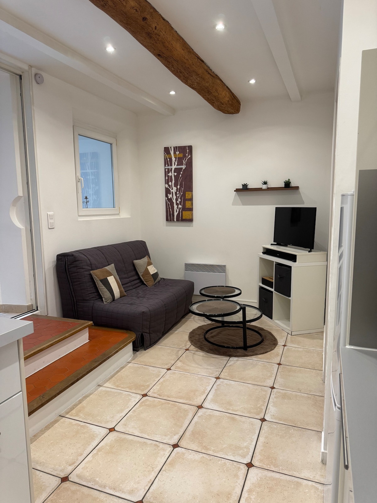 Appart typiquement provençal avec le charme des tommettes et de son plafond restaurée au gout du jour. Il offre une grande pièce a vivre avec cuisine équipée. Il peut accueillir 5 pers : Une chambre avec salle de bain composé d'une baignoire ainsi qu'une mezzanine offrant 2 couchages sécurisés avec originalité pour le plaisir des enfants. Il est situé dans le centre du village, proche toute commodité. Cet appart vous offrira un voyage en Provence, avec cette vue dégagé et lumineuse