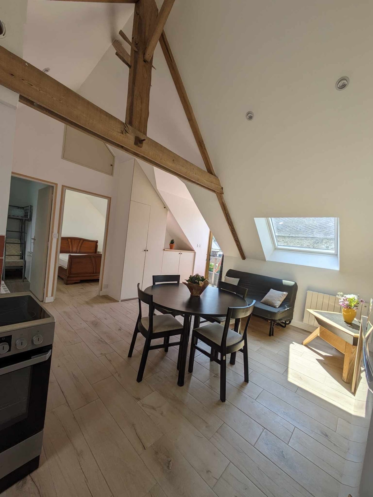 Perfectly placed in the historic heart of Dinan, this beautifully renovated city centre apartment is situated at the top of the famous medieval street, 'The Jerzual'. Dinan's restaurants, shops and historic buildings are just a few steps away. This second floor apartment has one (double) bedroom and a fold-down bed/setee. The stylish kitchen has all new appliances and the apartment is equipped with security doors and smoke and carbon monoxide detectors.