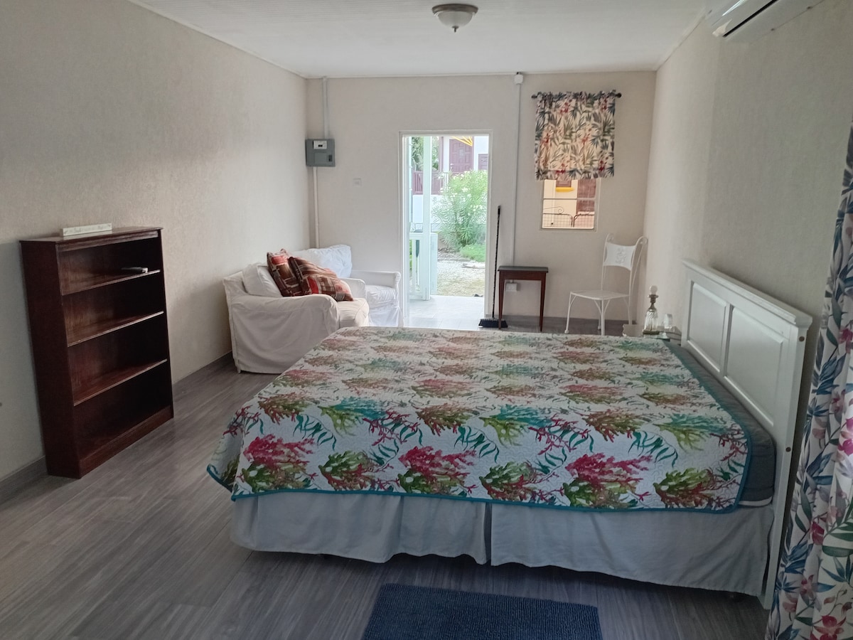 Welcome to our large studio cottage, blending Caribbean charm with modern style. The contemporary interior, air-conditioned comfort, and sleek kitchen and bathroom ensure a delightful stay. Your private entrance opens to an exclusive garden. Just a short stroll to Pebbles Beach and Carlisle Bay, it offers easy access to stunning coastal spots. Experience the best of both worlds: modern living in a peaceful Caribbean setting, embraced by the warmth of a hospitable family in beautiful Barbados.
