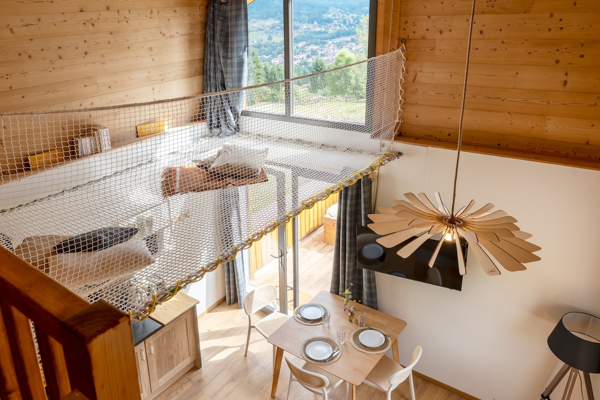 Ce chalet situé dans un environnement rural et verdoyant offrant de belles randonnées pédestres ou cyclistes ,point de départ idéal pour des visites côté Alsace ou côté Vosges Chalet neuf à faible impact environnemental Cuisine équipée ,salle de bain ,une chambre avec lit de 160x200 , une deuxième chambre en mezzanine avec deux lits de 90x200, télévision et wifi .Une très belle terrasse surplombant un étang ainsi qu un jacuzzi privé sont à votre disposition pour de beaux moments de détente.