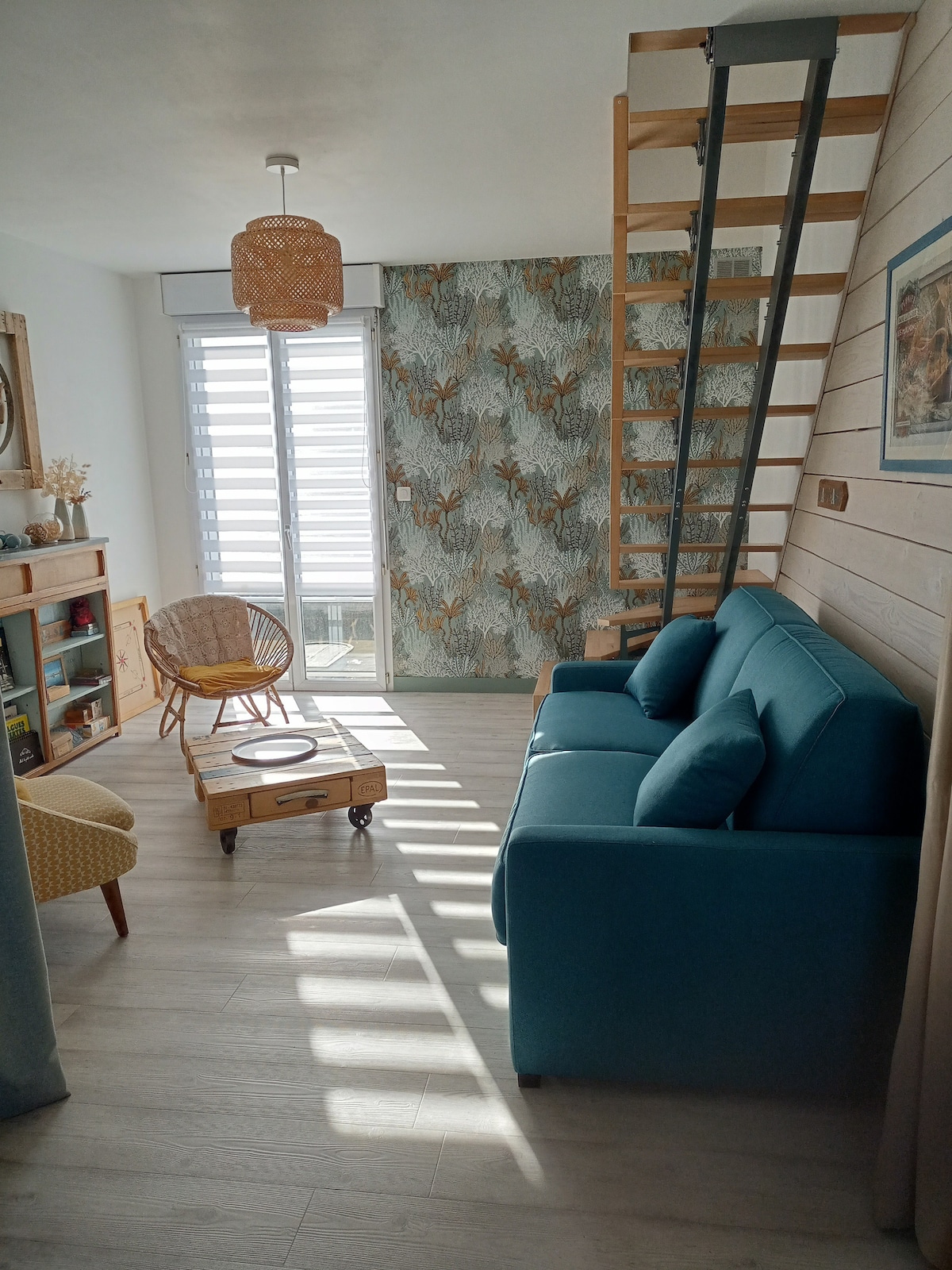 Our apartment is perfectly situated in Petit Maroc, the oldest neighbourhood in Saint Nazaire. From the living room, you can watch the canal lock in operation and the boats (boat movements). You can get to all the tourist attractions of the city, the beach and heart of the city, Place du Commando, on foot or by bike. With a surface area of 40m², the kitchen area faces east, on the garden side and the living room and bedroom face west, with a clear view of the sea and the setting sun.