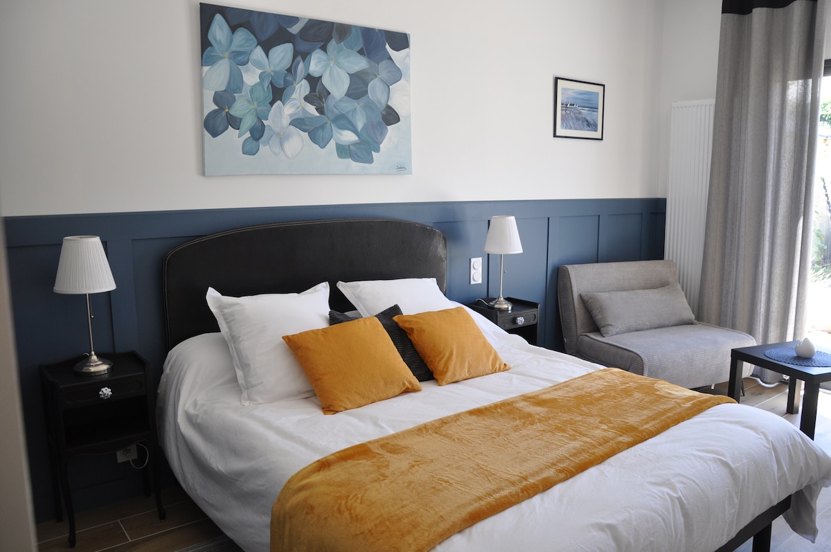La mer a la campagne, chambre située a 800m de la plage, du GR8 +Vélo océan, ainsi que les commerces, et la gare .la chambre avec lit 160, Salle d'eau, et terrasse privative.. Tarif indiqué avec petits déjeuners inclus. Terrasse équipée de frigo et micro ondes pour réchauffer vos plats et manger sur place avec accès direct à votre chambre. Parking privé, et garage fermé pour les vélos 🚲. les animaux non acceptés.